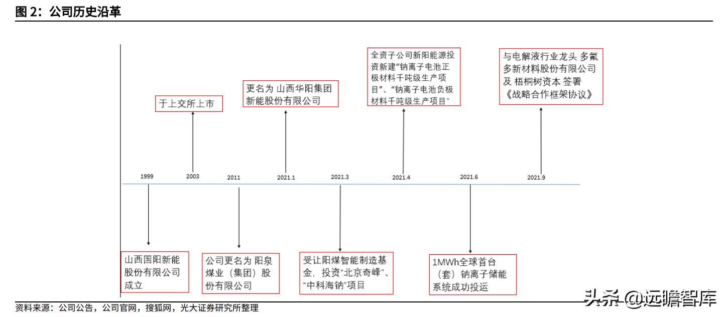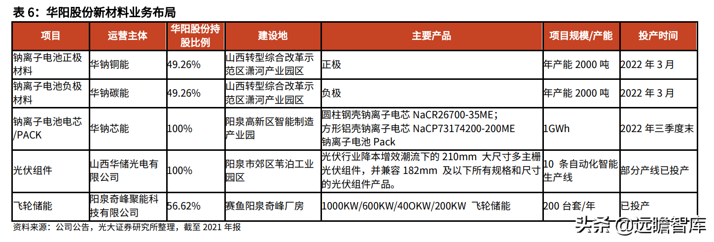 同时公司积极参与集团的新材料转型: 2021 年 1 月,公司名称由“阳泉煤业(集团)股份有限公司”变更为“山西华阳集团新能股份有限公司”,证券简称由“阳泉煤业”变更为“华阳股份”;2021 年 3 月,公司受让阳煤智能制造基金,投资“北京奇峰”、“中科海钠”项目,分别涉及飞轮储能、钠离子电池业务;2021 年 4 月,公司与中科海钠共同投建钠离子电池正极材料千吨级生产项目、钠离子电池负极材料千吨级生产项目,进一步推进钠离子电池布局;2021 年 6 月 28 日,公司 1MWh 全球首台(套)钠离子储能系统成功投运;2021 年 9 月,公司与电解液行业龙头多氟多新材料股份有限公司及梧桐树资本签署《战略合作框架协议》,拟就六氟磷酸钠和钠离子电池、电解液添加剂、负极材料、研究院和工业互联网等领域展开深度合作。