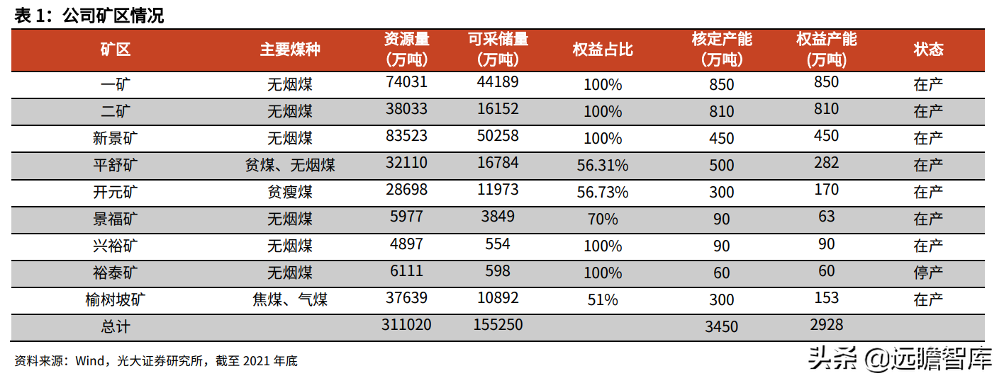 截至2021年底,公司煤炭资源量总计 31.1 亿吨,可采储量为 15.5 亿吨,煤种主要为无烟煤,兼有贫煤、贫瘦煤、焦煤、气煤。