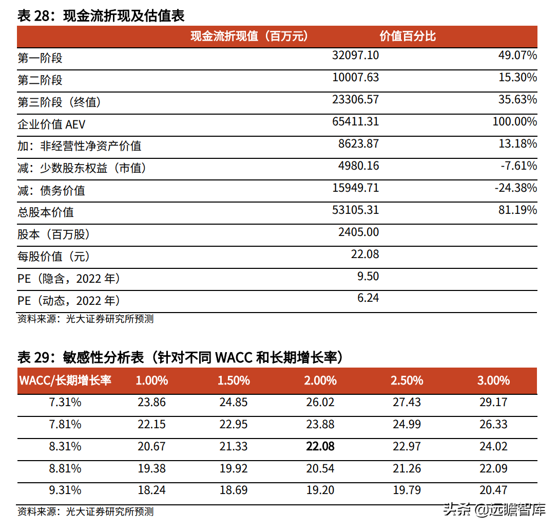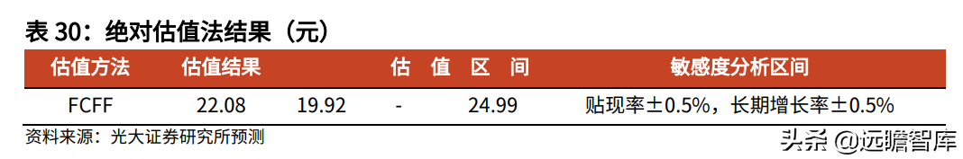 根据绝对估值方法,取FCFF±0.5%区间为估值参考,对应公司股价合理价值区间为19.92-24.99 元/股。