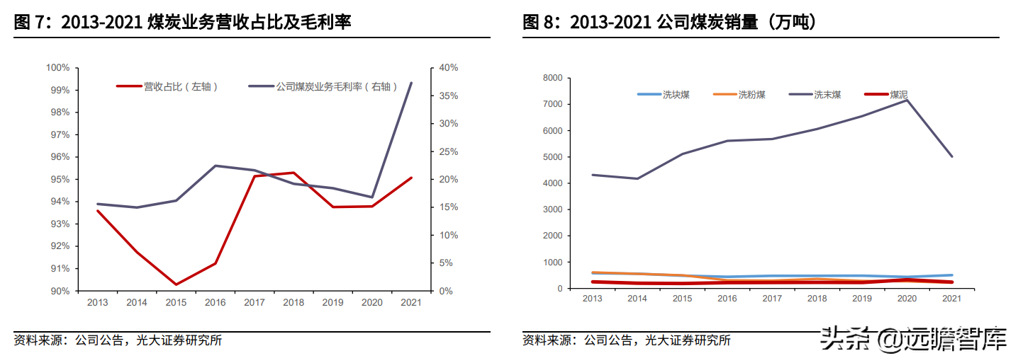 2021 年,公司煤炭综合售价为 605 元/吨,同比+69.5%,其中洗块煤、洗粉煤、洗末煤、煤泥综合售价分别为 920、1076、569、277 元/吨,同比+55.3%、+62.1%、+66.6%、+111.4%。由于公司采购集团及其子公司煤炭进行统一销售,导致毛利率始终维持较低 水平。