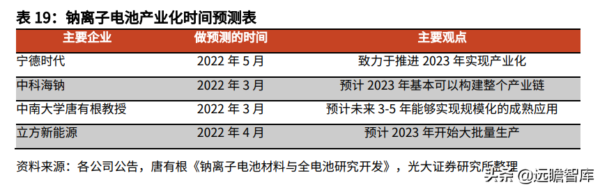 2022 年 3 月 25 日中南大学唐有根教授在《钠离子电池材料与全电池研究开发》中提及,钠离子目前还处于一个商业化的早期。从规模化应用来说还有一些时日,预计未来 3-5 年能够实现规模化的成熟应用。