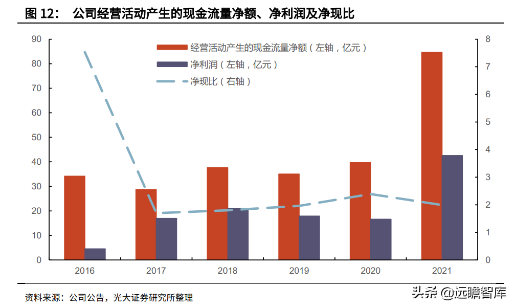净现比是经营性现金流量净额和净利润的比值,可以很好地衡量公司的盈利质量,一般认为达到 1 就是优秀的水平。华阳股份上市后,经营活动产生的现金流量净额一直为正值,2017 年后公司净现比基本上保持平稳。这说明公司自身有良好的“造血”能力,经营情况较好。华阳股份的净现比近年一直保持在 1.7 以上,2020年达到 2.39,2021年净现比较2020年有所下降。(报告来源:远瞻智库)