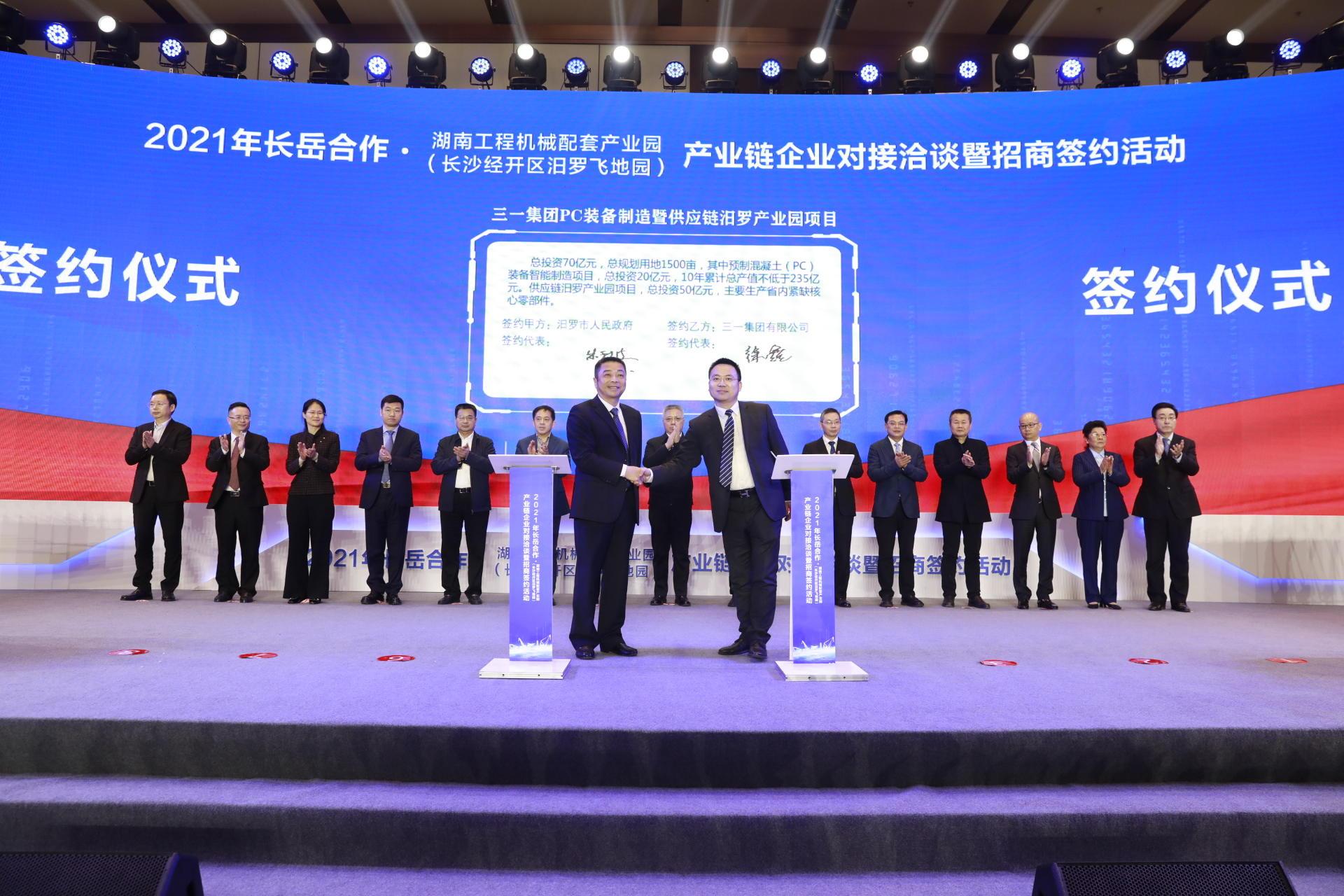 参与本次签约的10家企业包括了三一集团和山河智能集团两大主机企业。其中三一集团PC装备制造暨供应链汨罗产业园项目总投资70亿元,主要建设预制混凝土(PC)装备制造和供应链汨罗产业园;山河智能汨罗产业园项目总投资50.2亿元,主要建设主机产品生产项目和配套企业进驻。投资20亿元的湖南工程机械职业技术学院,投资15亿元的上元集团精密机械制造园、伟邦智慧产业园2个"园中园"项目,宁波正一砼泵配件制造项目、苏州万利康精密组件制造项目、浙江永鹏实业机械紧固件项目、苏州宏德冠精密电子制造项目、青岛速霸数控机床项目5个工程机械配套项目同时在活动中签约。