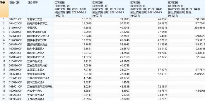 在持股数量靠前的20只基金中,近一个月(截至8月25日)排名第一的是华夏军工安全。