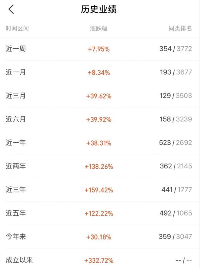从历史业绩来看,这只基金近一年收益率为38.31%,近五年收益率为122.22%。