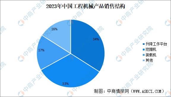 从产品销售结构来看,2023年,我国工程机械产品总销量601151台,以升降工作平台、挖掘机和装载机为主,2023年三大品类销量占比分别为34%、33%和17%,合计占比84%。其中,挖掘机销售额占比约1/3,与全球整体情况一致。据统计,2023年全球工程机械制造商50强总销售额2238.06亿美元,其中挖掘机业务排名前20的企业,挖掘机板块总销售额为650.47亿美元,占全球工程机械制造商50强总销售额的29.06%,接近三分之一。