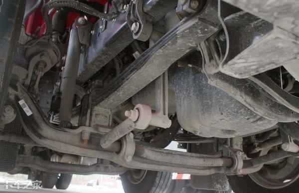江铃自主生产的鼓式制动转向车桥最大承载质量6.5吨,采用当下载货车型普遍使用的三片簧抛物线钢板悬挂,而且在减震方面带有立式油压减震以及横向稳定杆。