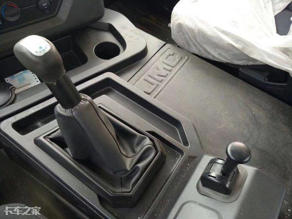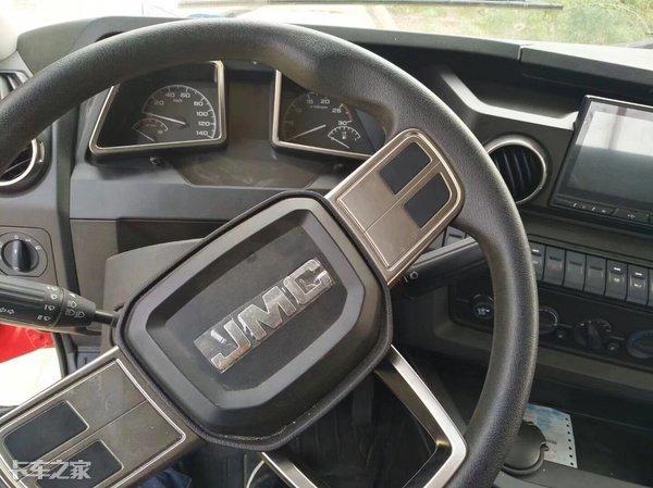 从简洁的四幅式方向盘看出该车型作为一款专注于工程设备运输的车型,其中心带有JMC镀铬标识;仪表盘采用独有的对称四棱筒形设计,其中间为双色液晶显示屏。