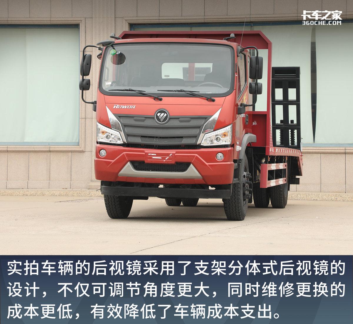 因为车辆经常通行于工地,工厂等路况较为复杂的工况之中,实拍车辆的后视镜采用了支架分体式后视镜的设计,不仅可调节角度更大,同时维修更换的成本更低,有效降低了车辆成本支出。