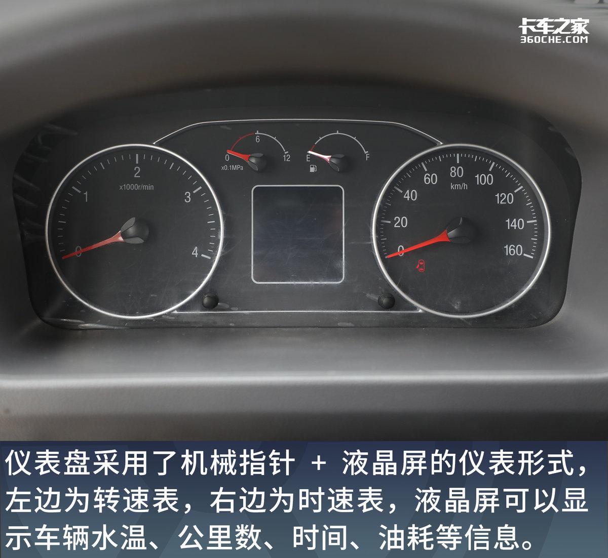 车辆的仪表盘采用了我们卡友十分熟悉的机械指针+液晶屏的仪表形式,左边为转速表,右边为时速表,液晶屏可以显示车辆水温、公里数、时间、油耗等信息。