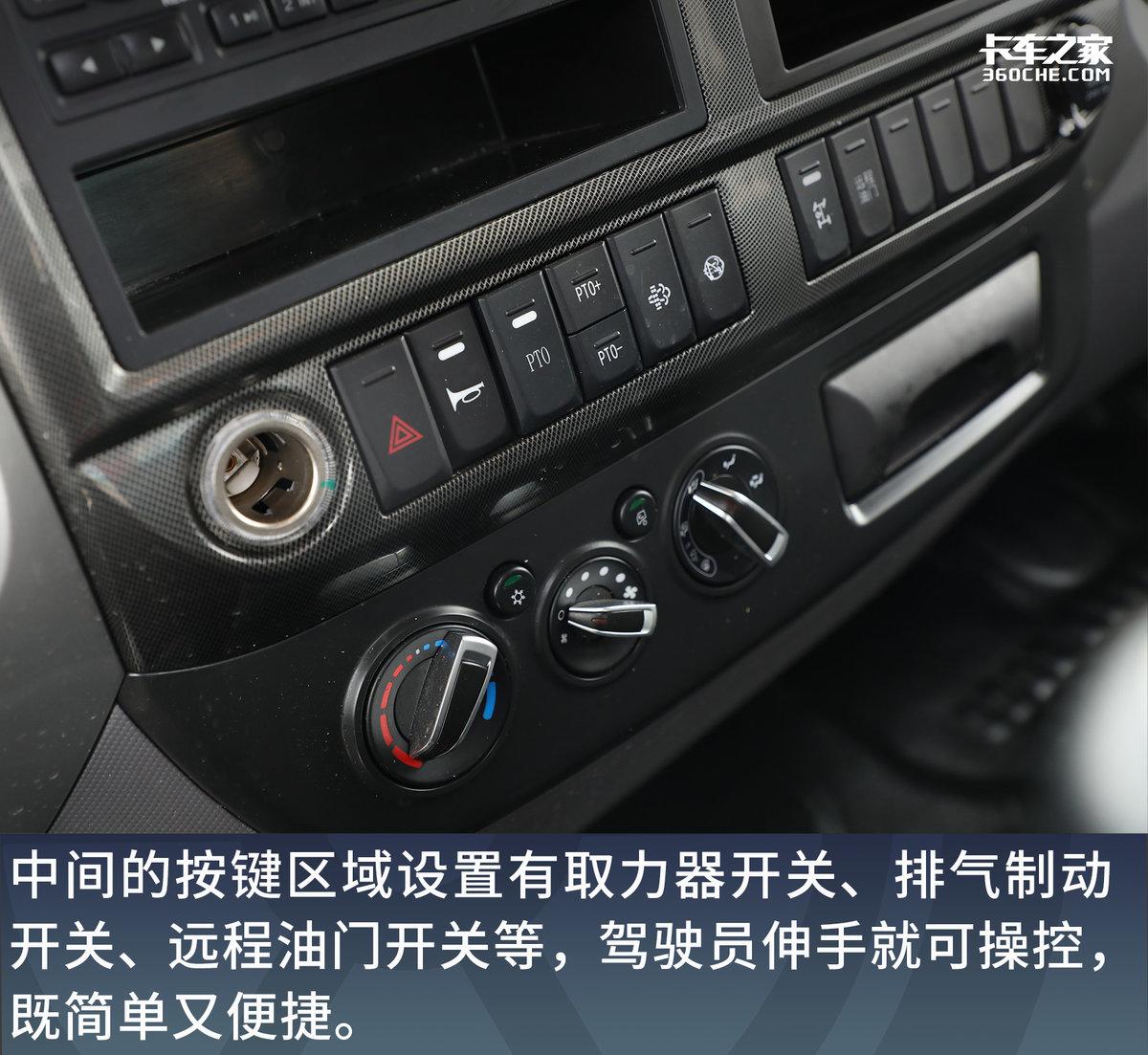 而中间的按键区域设置有取力器开关、排气制动开关、远程油门开关等,方便我们驾驶员伸手操控,既简单又便捷。