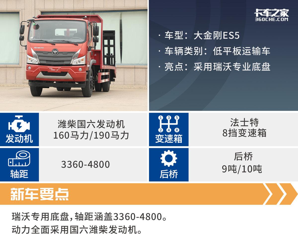 值得一提的是,大金刚ES5低平板运输车采用了福田瑞沃深度定制开发的专用底盘,针对低平板运输场景进行深度定制化开发,满足全工况工程运输,保障高效出勤。