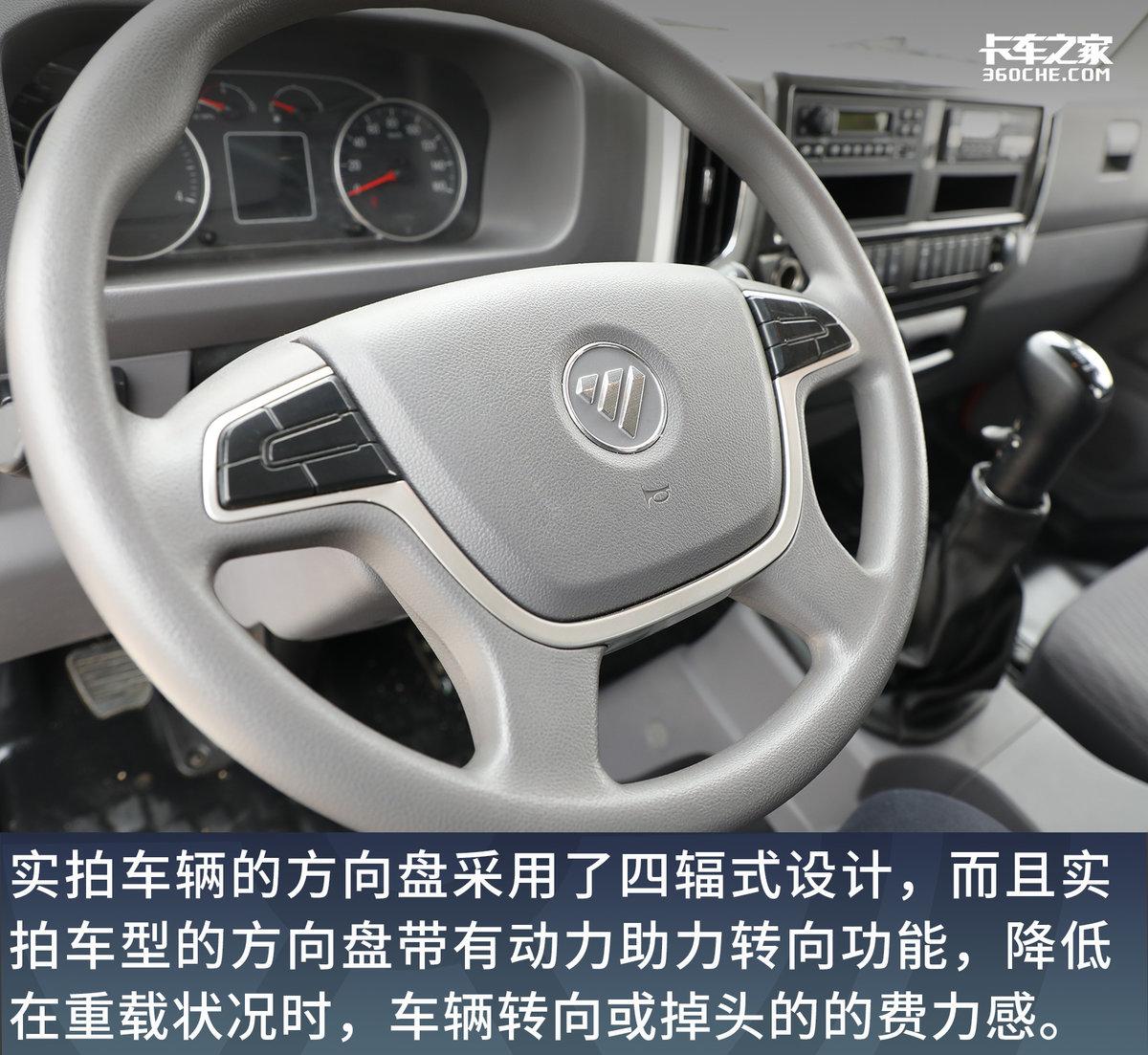 实拍车辆的方向盘采用了四辐式设计,根据实拍图片我们可以看出这款大金刚ES5的方向盘预留有多功能控制按键;而且实拍车型的方向盘带有动力助力转向功能,降低驾驶员在重载状况时,车辆转向或掉头的费力感。