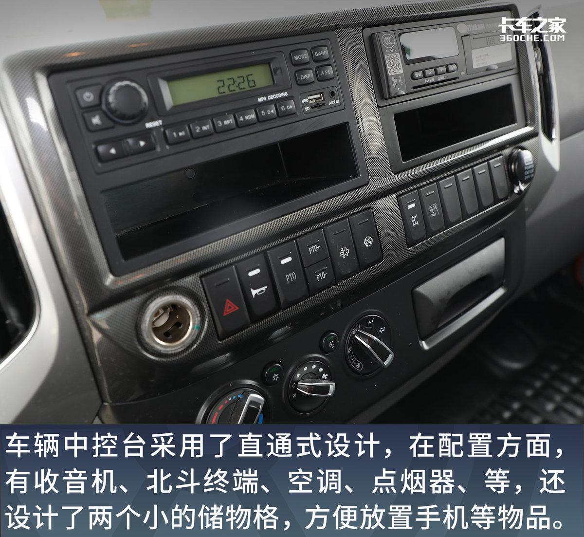车辆中控台采用了直通式设计,在配置方面,有收音机、北斗终端、空调、点烟器、等,还设计了两个小的储物格,方便车上人员对手机、收据、通行卡的存放。