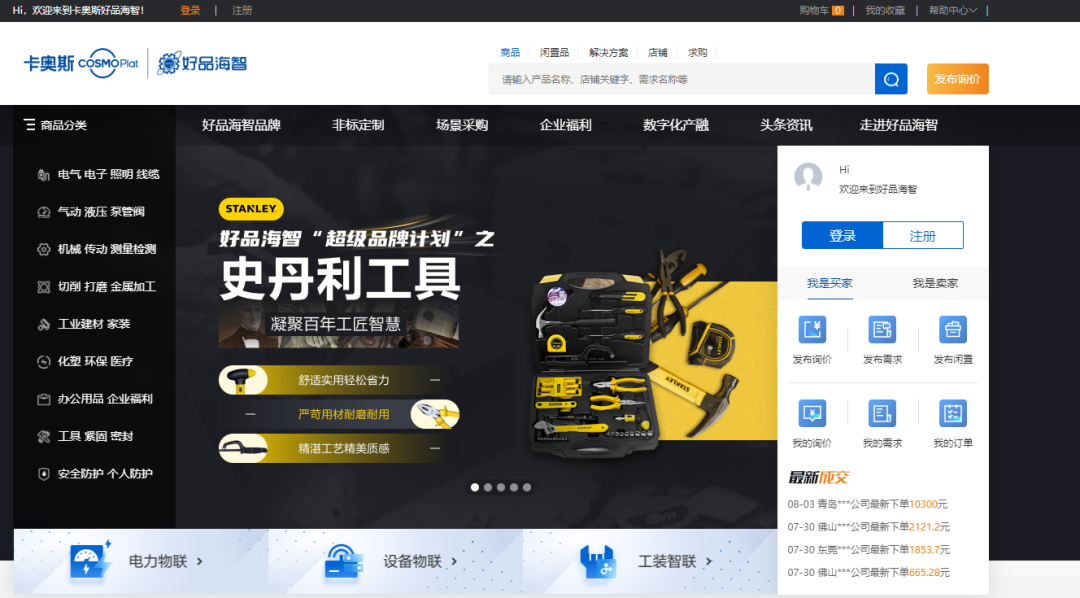 工业服务物联网平台实行供应链节点全覆盖,涵盖工业品超市、企业培训、智能制造、闲置资产盘活、产业链金融、园区成套服务等板块。好品海智现已并联企业用户几十万家,SKU数上千万,解决方案上百万,可满足不同企业用户需求。