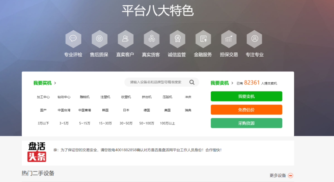 深圳盘活网络科技有限公司是深圳盘活网络科技有限公司旗下专注工业二手机械设备B2B的交易平台,专注为工厂和设备商家提供工业二手机械设备的专业信息分类和发布、全网推广、交易撮合、代客评检、售后保障、在线交易等一站式服务。