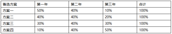 1.某施工单位拟投资一项目,在投资总额和年收益不变的情况下,四个备选方案各年投资比例如下表(投资时点均相同),则该改单位较为有利的方案是()。