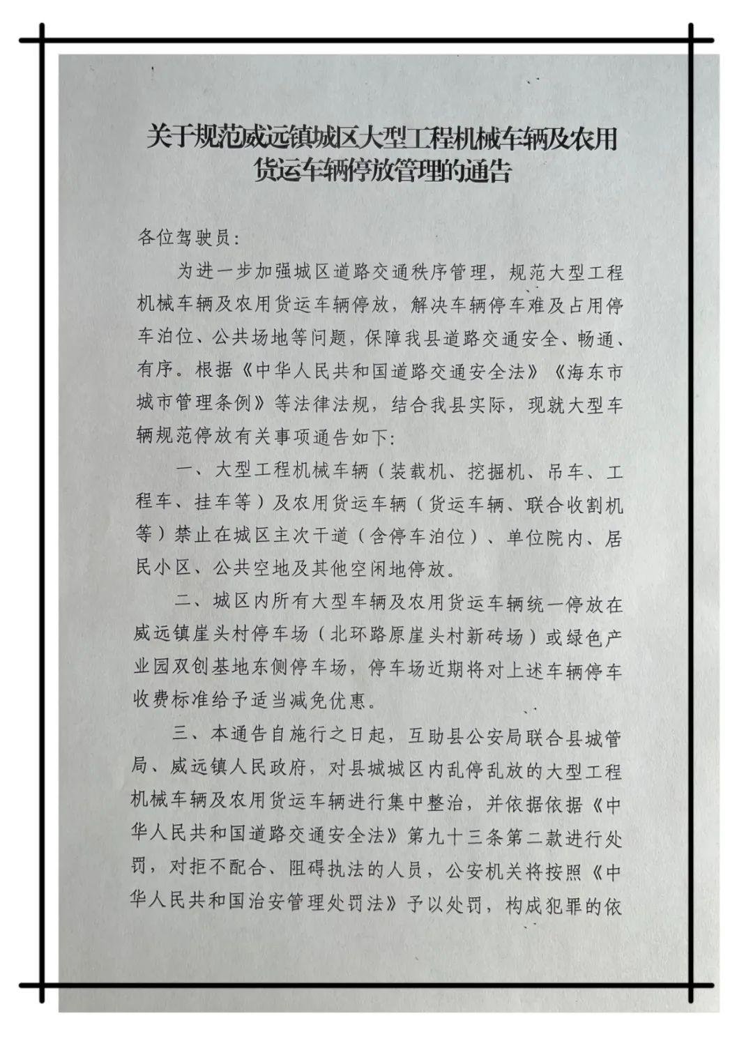 为进一步加强城区道路交通秩序管理,规范大型工程机械车辆及农用货运车辆停放,解决车辆停车难及占用停车泊位、公共场地等问题,保障我县道路交通安全、畅通、有序。根据《中华人民共和国道路交通安全法》《海东市城市管理条例》等法律法规,结合我县实际,现就大型车辆规范停放有关事项通告如下: