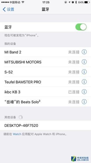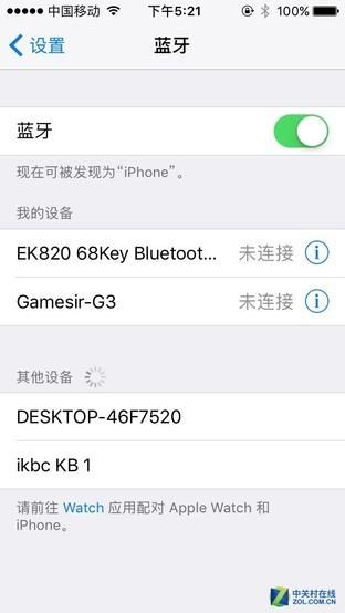 为了测试第二台设备,笔者管同事又借了台iphone。重复上述操作,在Fn+F5结束后5秒内点击了F3,这台手机上显示的设备名称就是ikbc KB 3,连接即可。