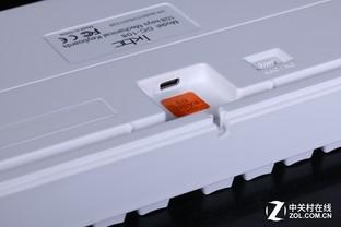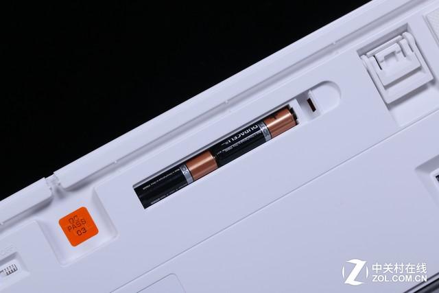 在背板凹槽的右下方置有电池夹,可安装两枚七号电池,因为它是一款蓝牙双模键盘。