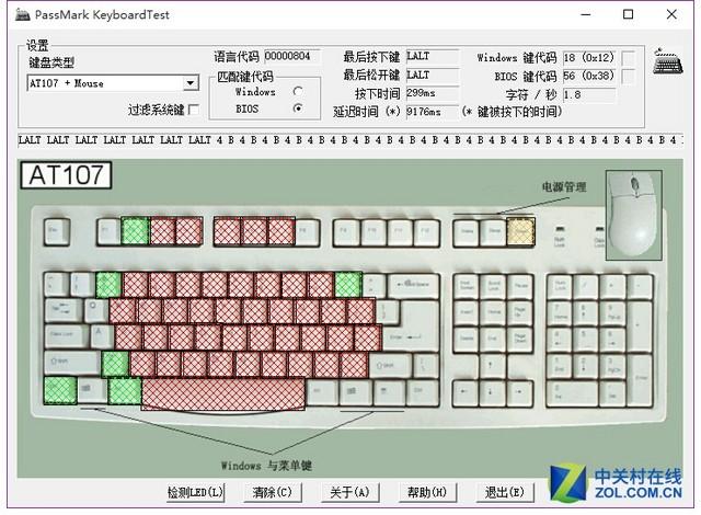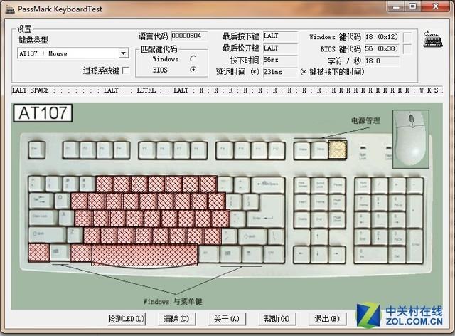 最后,让我们进入键盘测试 环节,来实际感受一下该款键盘的性能。我们就先来测试一下它的按键冲突,使用的是PassMark KeyboardTest软件。