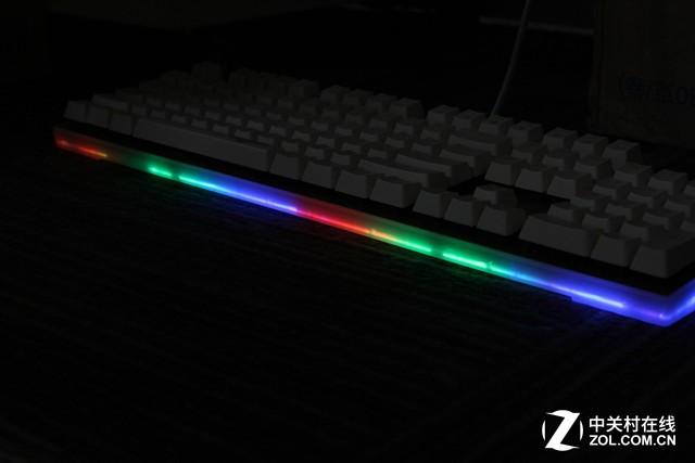 其实键盘底部的发光放在桌子上完全看不到,不过透过底壳的亚克力材质,键盘侧面的四周都会形成发光带,看起来效果十分炫酷。并且在键盘上我们可以通过FN+PS/SL/PB的组合键来调节键盘的发光部位。