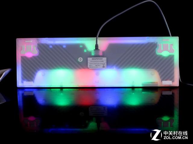 新贵GM350通电后的效果如图,依旧采用了分区混光的设计,从背面我们也可以看到这款键盘除了正面发光之外,底部的背光效果如何。