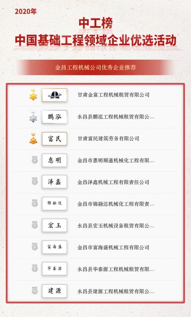 为推动行业良性发展,发掘行业标杆及各省市优质企业,基础工程建设网组织举 办了"中工榜-中国基础工程领域企业优选活动",面向全国基础工程领域的上万家企业,不仅得到了业内专业机构的高度认可,更获得了社会各界的广泛关注。 “金昌工程机械公司优秀企业推荐”,从企业综合实力、社会责任感、技术创新能力和服务水平等多方面进行综合评审,并结合广大消费者在互联网上对企业的支持数据来考核参赛企业,最终选出了金昌工程机械领域的十家优秀企业,现将对征选结果予以公示: