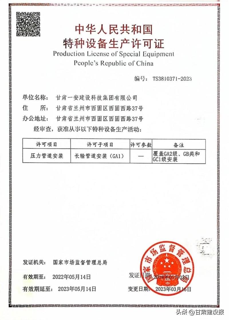 近日,甘肃建投一安公司成功取得国家市场监督管理总局颁发的《中华人民共和国特种设备生产许可证》(长输管道安装GA1 ),正式成为甘肃省首家具备GA1级长输管道安装许可资质的省属国有建筑安装施工企业。该许可是压力管道(长输管道) 安装施工领域的最高级别,此许可证的取得使甘肃一安在长输管道安装领域不受压力等级限制。同时一安公司还取得了石油化工工程施工总承包壹级资质,标志着该公司施工综合实力已经具备承担各类型石油化工工程的总承包施工和管理能力,此次资质升级使一安公司资质等级上了一个新台阶,补上了资质短板,也为企业带来更大的市场空间和发展机遇。