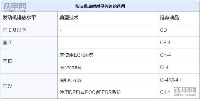 对于1990年以后,生产的高速自然吸气和涡轮增压四冲程柴油发动机,应使用CF-4以上级别的柴油发动加油;1998年以后出现的高速四冲程柴油发动机,为适应发动机技术改进和排放法规的要求,应使用CH-4以上级别的柴油机油。2002年以后生产的高速次冲程自然吸气和涡轮增加、重负荷柴油发动机,因为有废气再循环装置的存在和配方法规的要求及尾气后处理技术的要求,应使用CI-4以上级别的柴油机油,可代替CH-4、CF-4、CD系列。