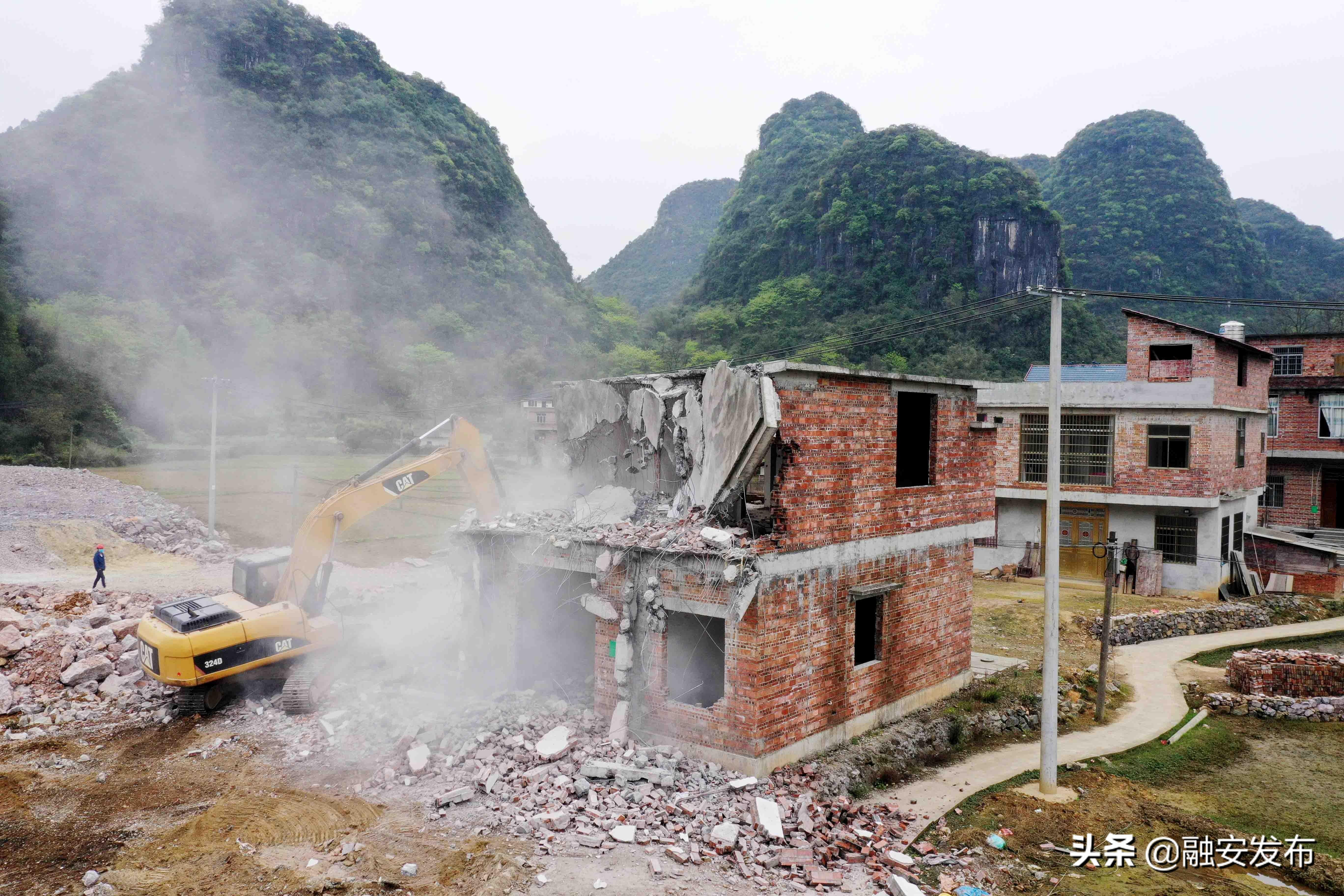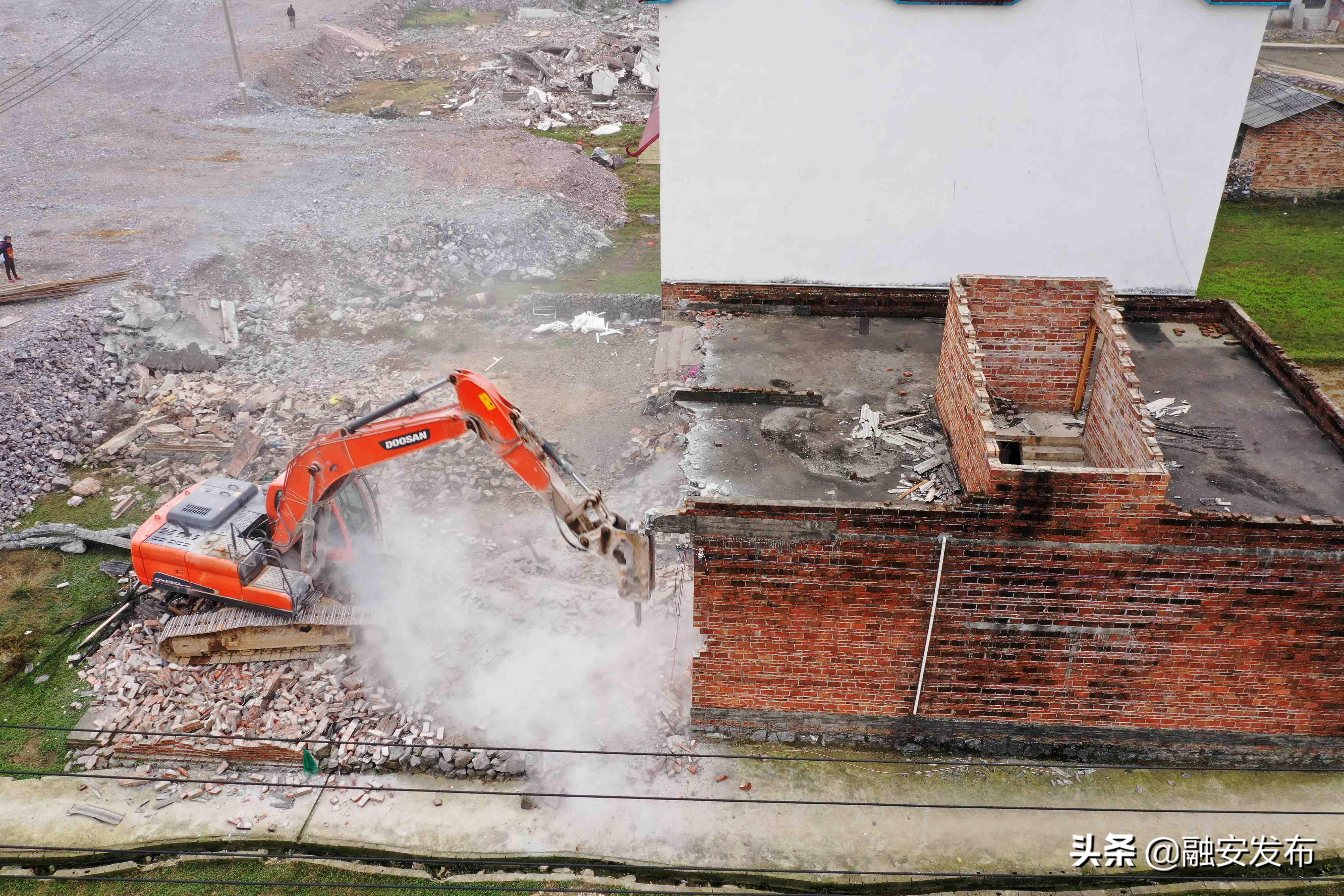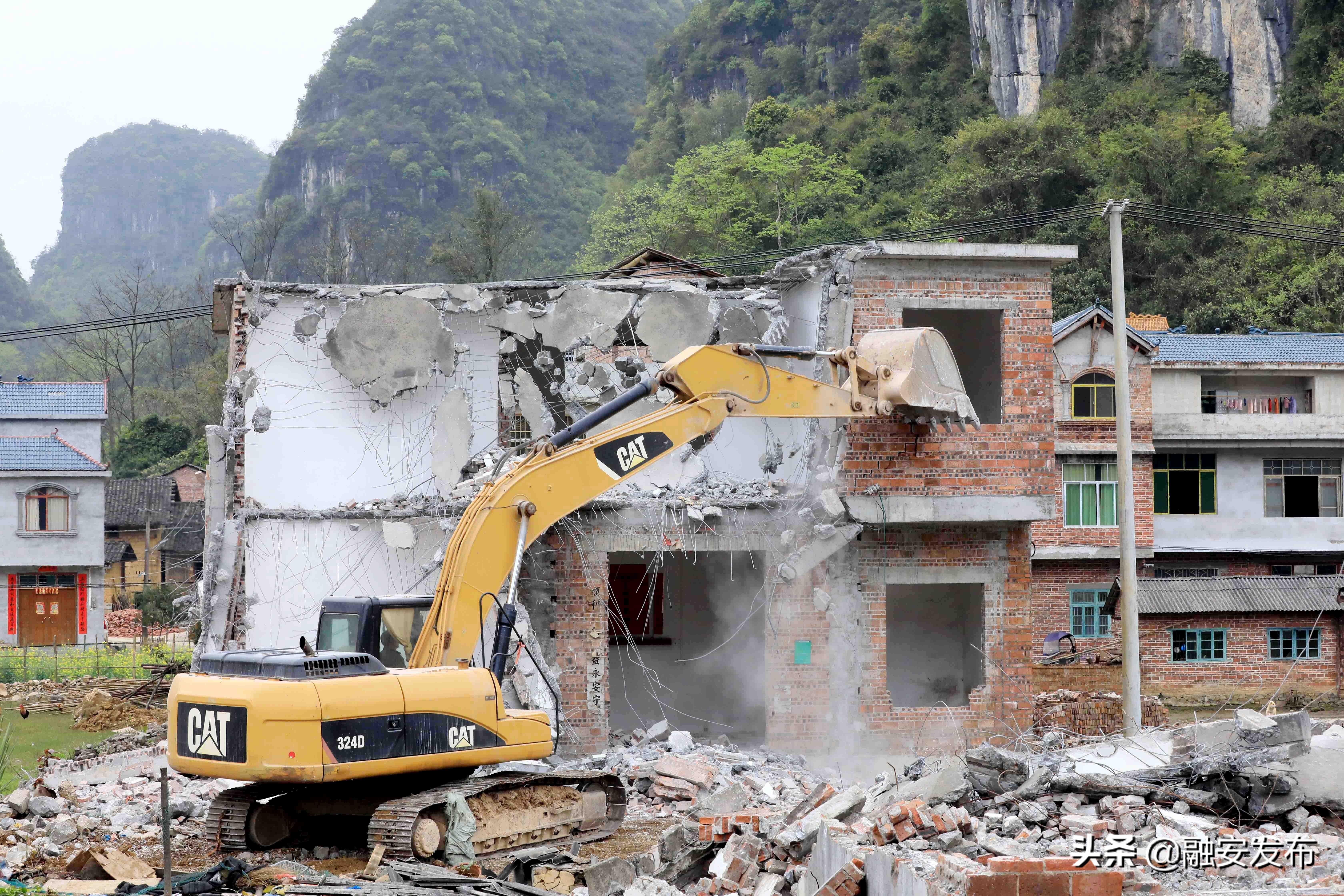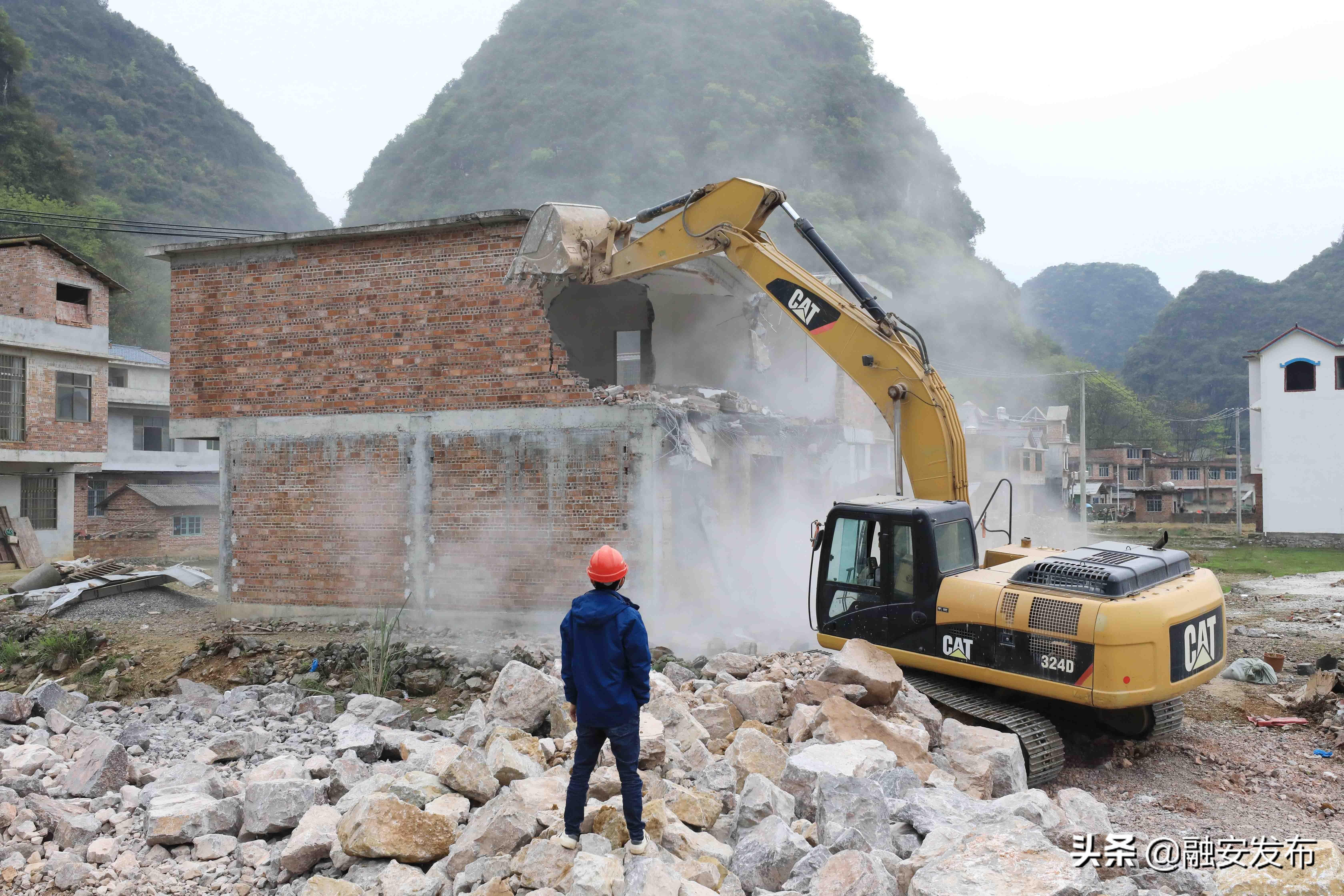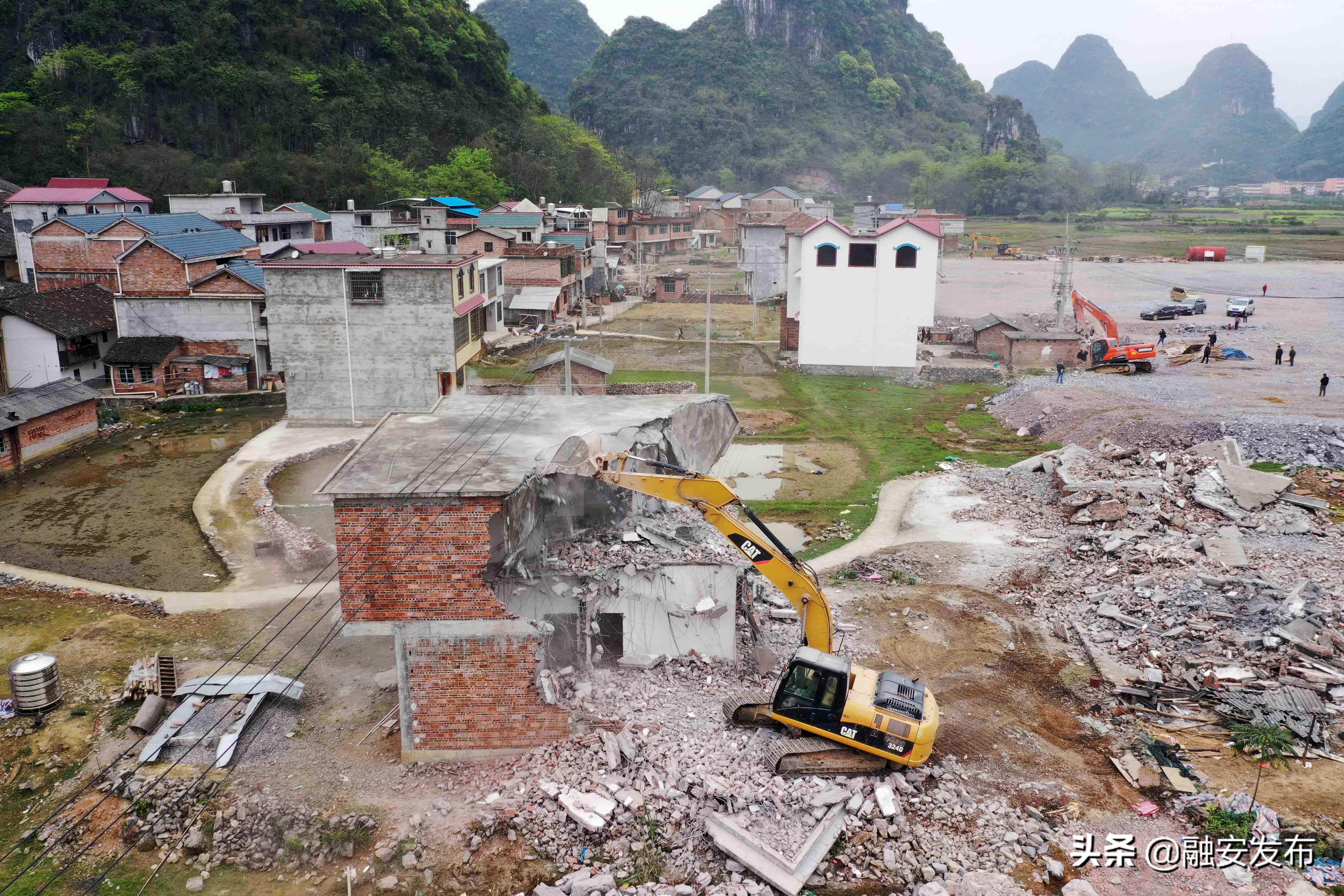 3月11日在桂柳高速广西柳州市融安县泗顶镇泗顶收费站施工工地,大型机械对房屋进行破拆。