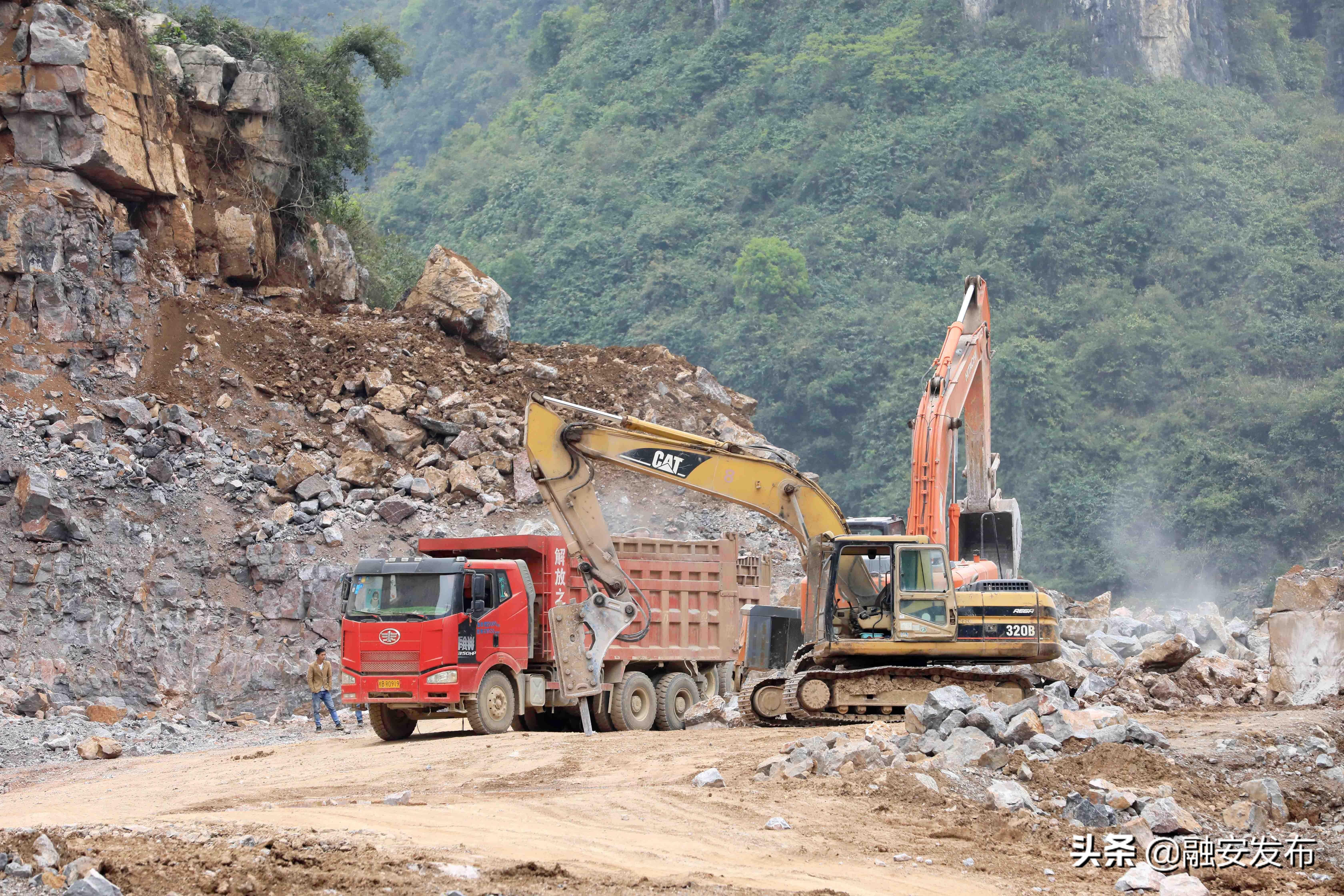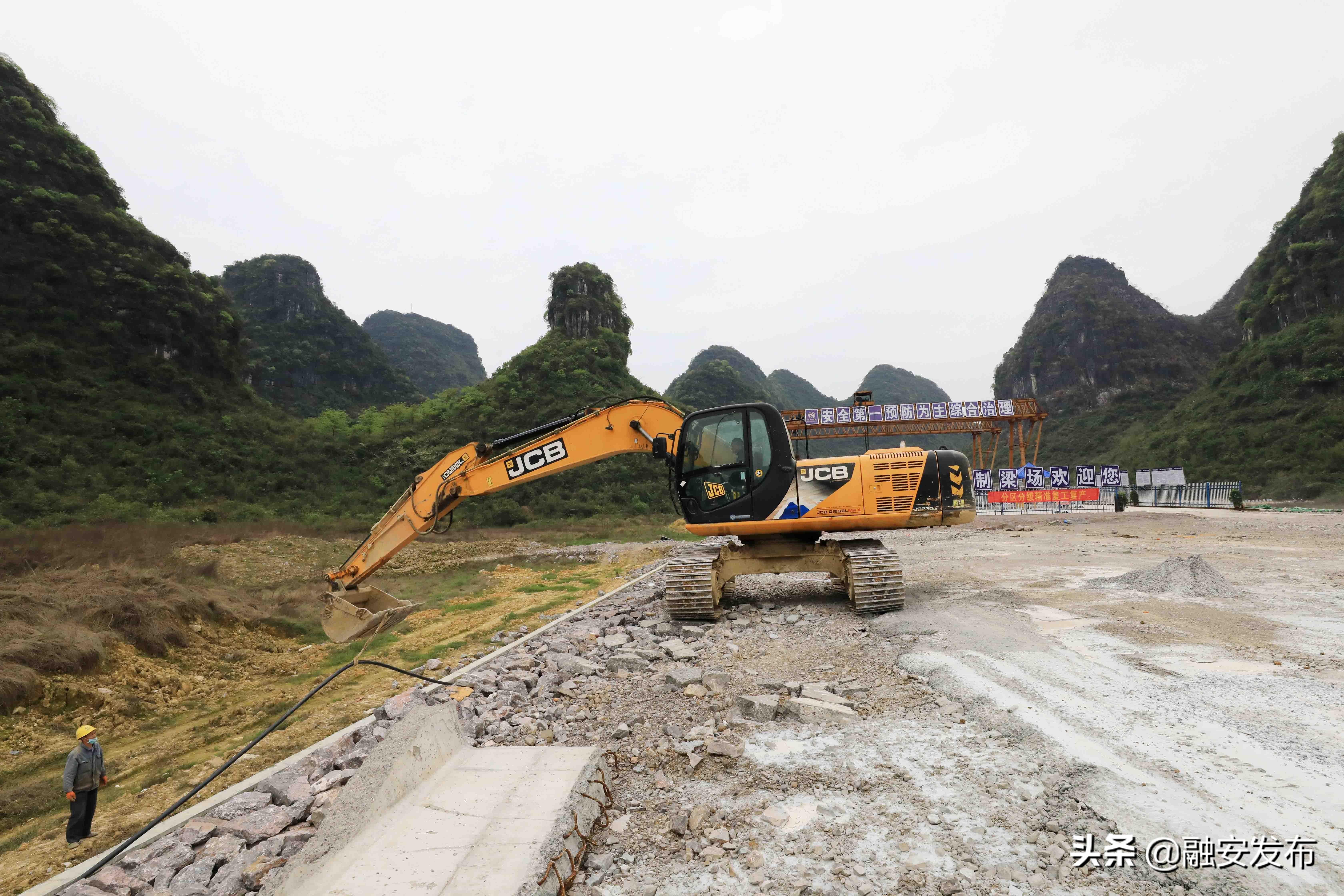 3月11日,在桂柳高速广西柳州市融安县泗顶镇路段,工程机械在施工作业。(谭凯兴 摄)