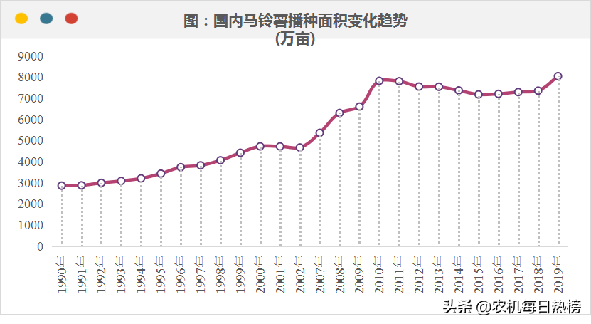 算下来,每亩马铃薯毛利4500元,小麦1080元,玉米2000元,毛利方面马铃薯遥遥领先,而每亩马铃薯成本在1500元,小麦640元,玉米200元。算下来,纯利也是马铃薯以大比分领先,所以我们就不难理解为什么近30年的时间里马铃种植面积一直在增加了。
