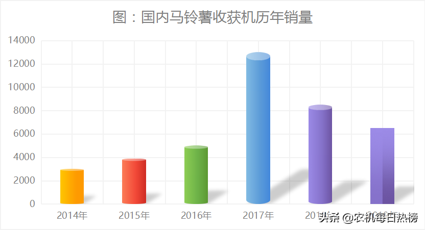 先看看国内马铃薯联合收获机的整体市场空间大小的规模容量。从上图可以看出来,2016年国家宣布马铃薯主粮化之后,2017年马铃薯收获机的的销量超过了12000台,2018年冲顶之后回落,已经低于10000台,土豆主粮化是个系统的工程,种植面积的增加需要需求支撑以及后续的加工、商品开发、市场推广等工作,所以2019年销量继续回落,约为6500台。