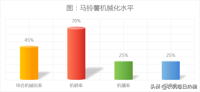 目前国内马铃薯综合机械化水平约为45%,从下图可以看出来,最关键的机播和机收两个环节是马铃薯种植中的短板,机械化率仍然非常低,这是全国的平均水平,事实上国内的马铃薯种植分为北方一季度作业区,中原二季度作业区和以西南为主的南方一二季混合作业区,不同作业区域对农机需求有差异,且机械化水平相差很大,目前看在收获环节多是挖掘式的分段式收获,真正的联合收获机率估计连5%都不到。