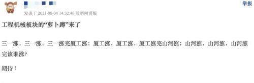 面对工程机械板块接连出现涨停股票,有股民在股吧说起了涨停版的“萝卜蹲”:三一涨,三一涨,三一涨完厦工涨;厦工涨,厦工涨,厦工涨完山河涨;山河涨,山河涨,山河涨完该谁涨?