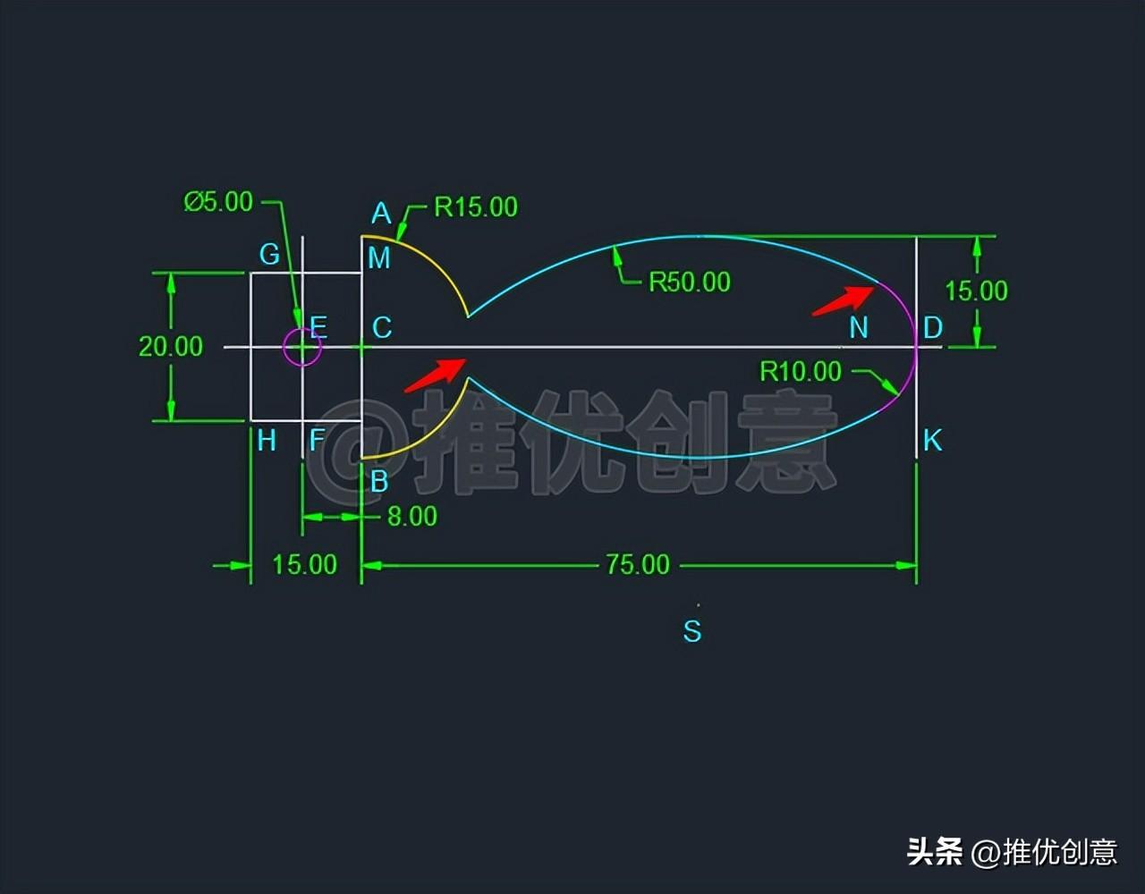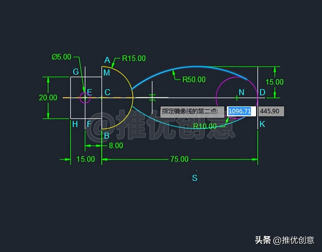 2.20、选中青色圆弧S ,命令行输入“MI ”后回车,启用“镜像 ”命令,指定白色水平中心线段CD 为镜像线 ,将它 镜像到下面 。
