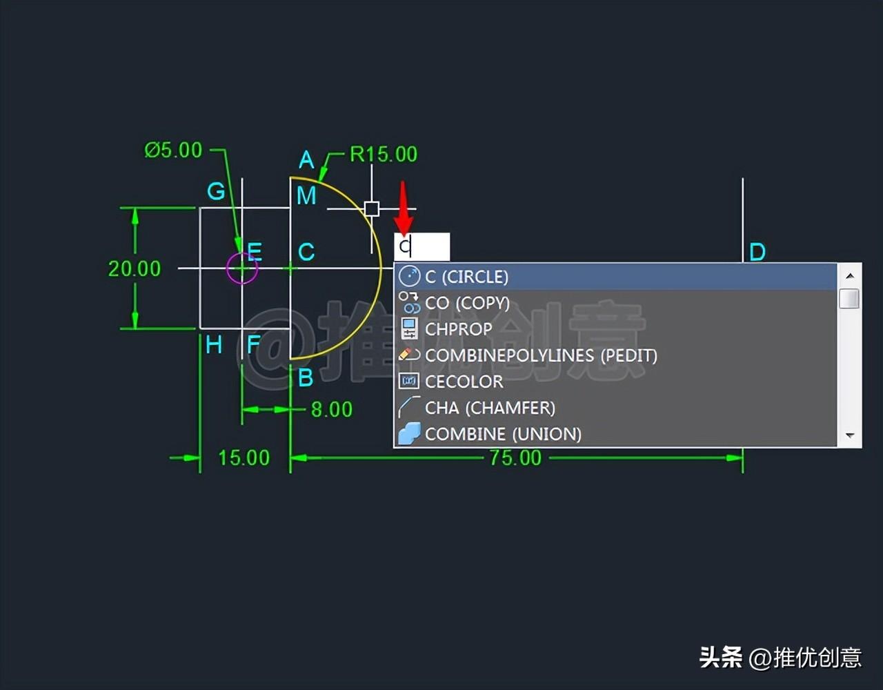 2.15、命令行输入“C ”后回车,启用“圆 ”命令。