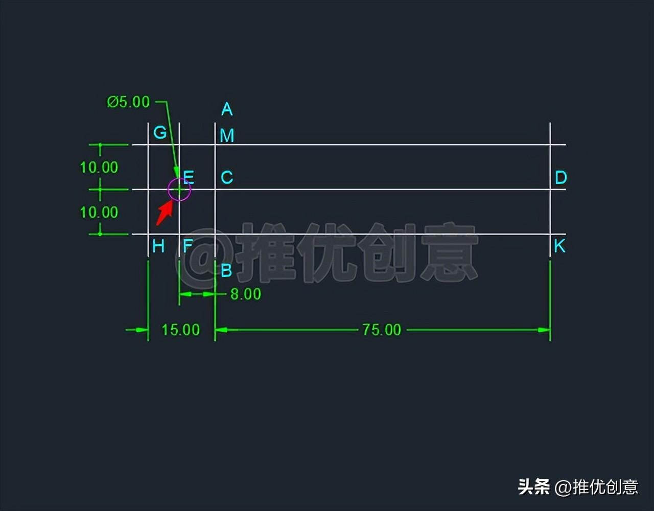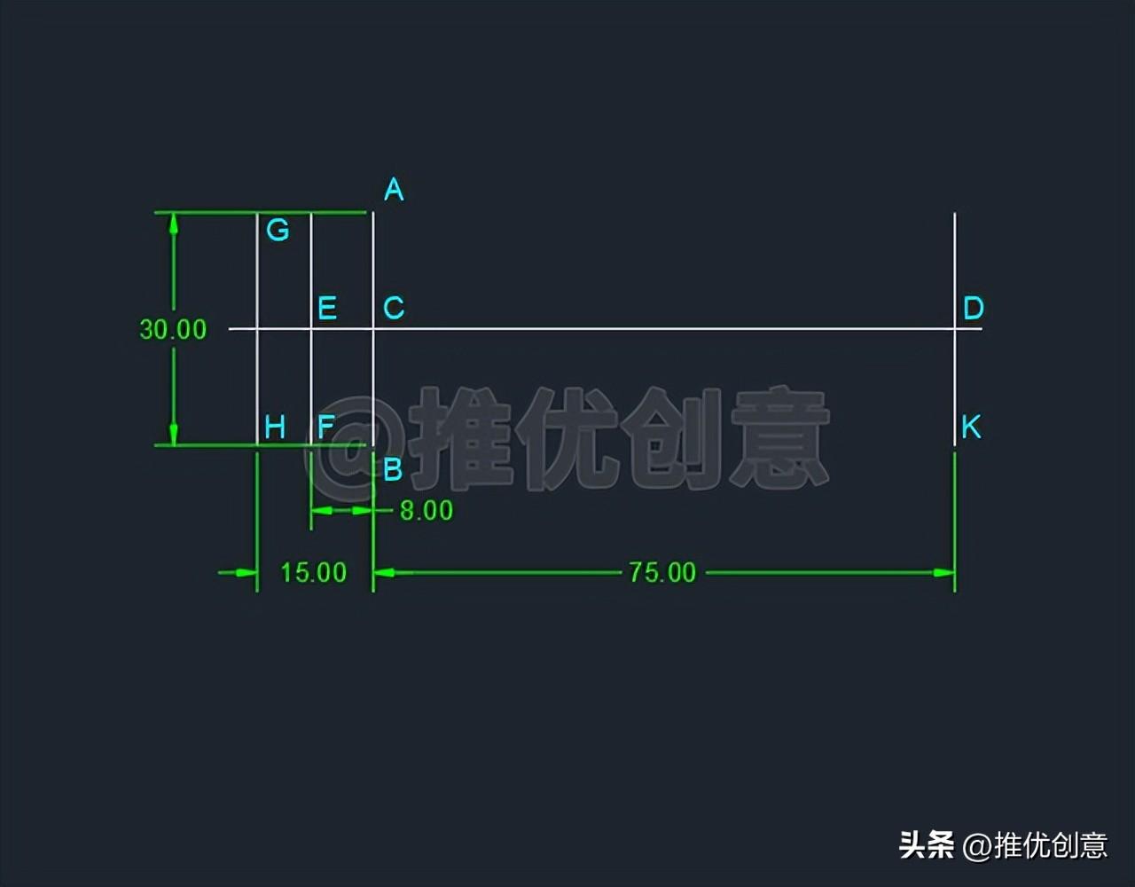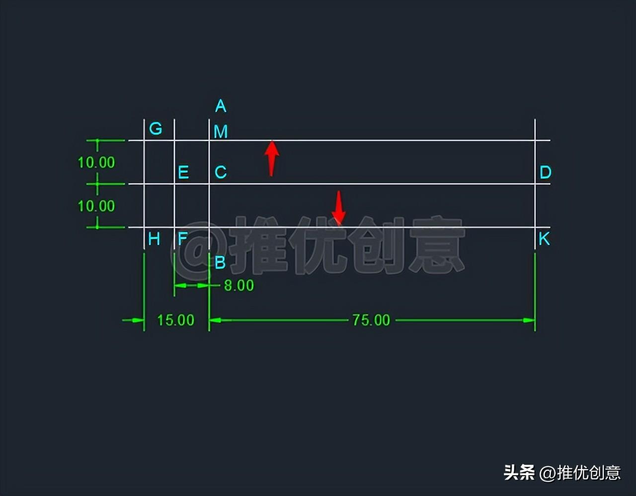2.4、命令行输入“O ”后回车,启用“偏移 ”命令,将白色水平中心线段CD 向上 、下 分别偏移10 个单位,得到白色水平线段GM 、白色水平线段HK 。
