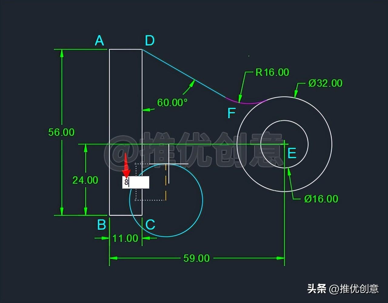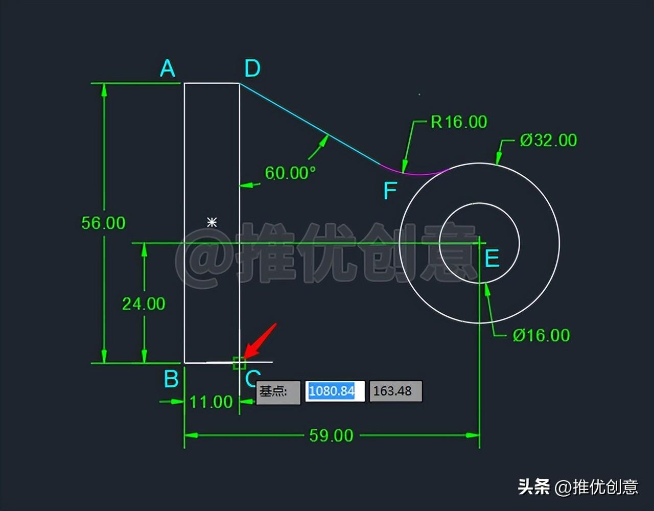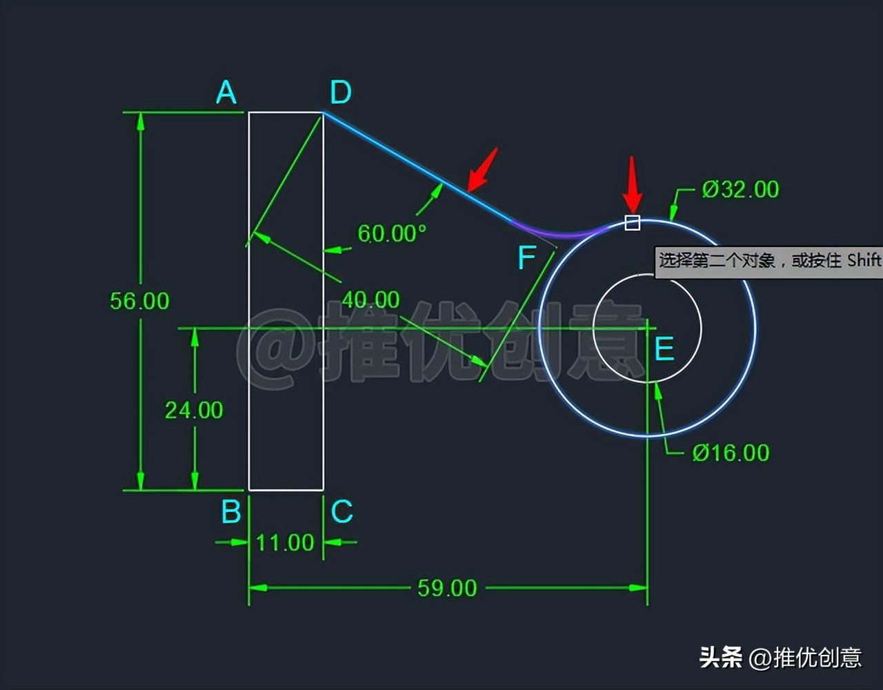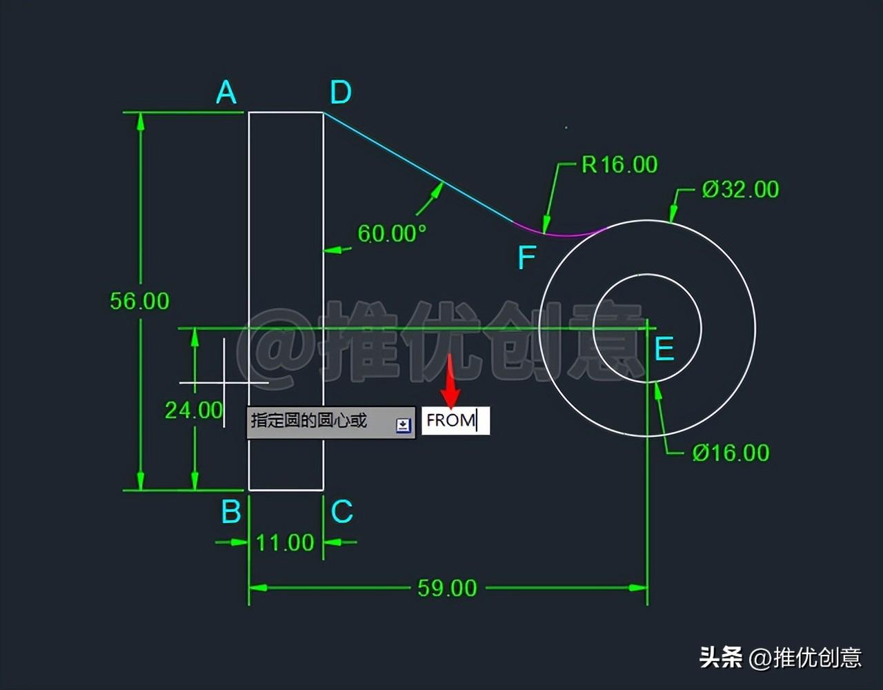 2.14、命令行输入“F ”后回车,启用“圆角 ”命令,接着输入“R ”后回车,选择设置圆角半径 ,输入圆角半径值 “16 ”后回车,对青色线段DF 与白色外圆E 倒圆角。