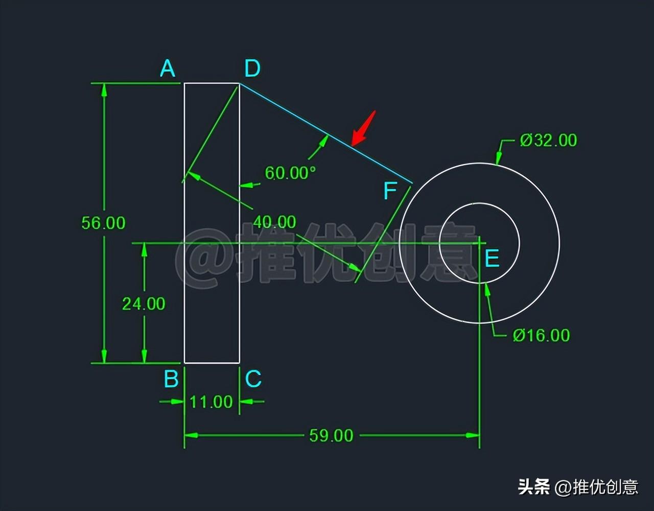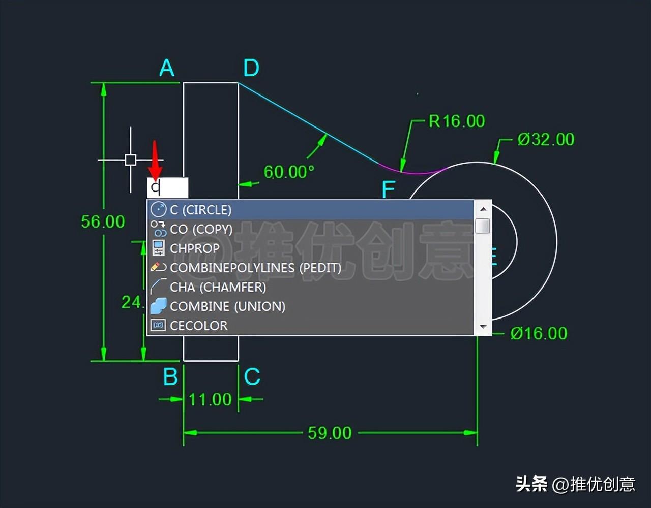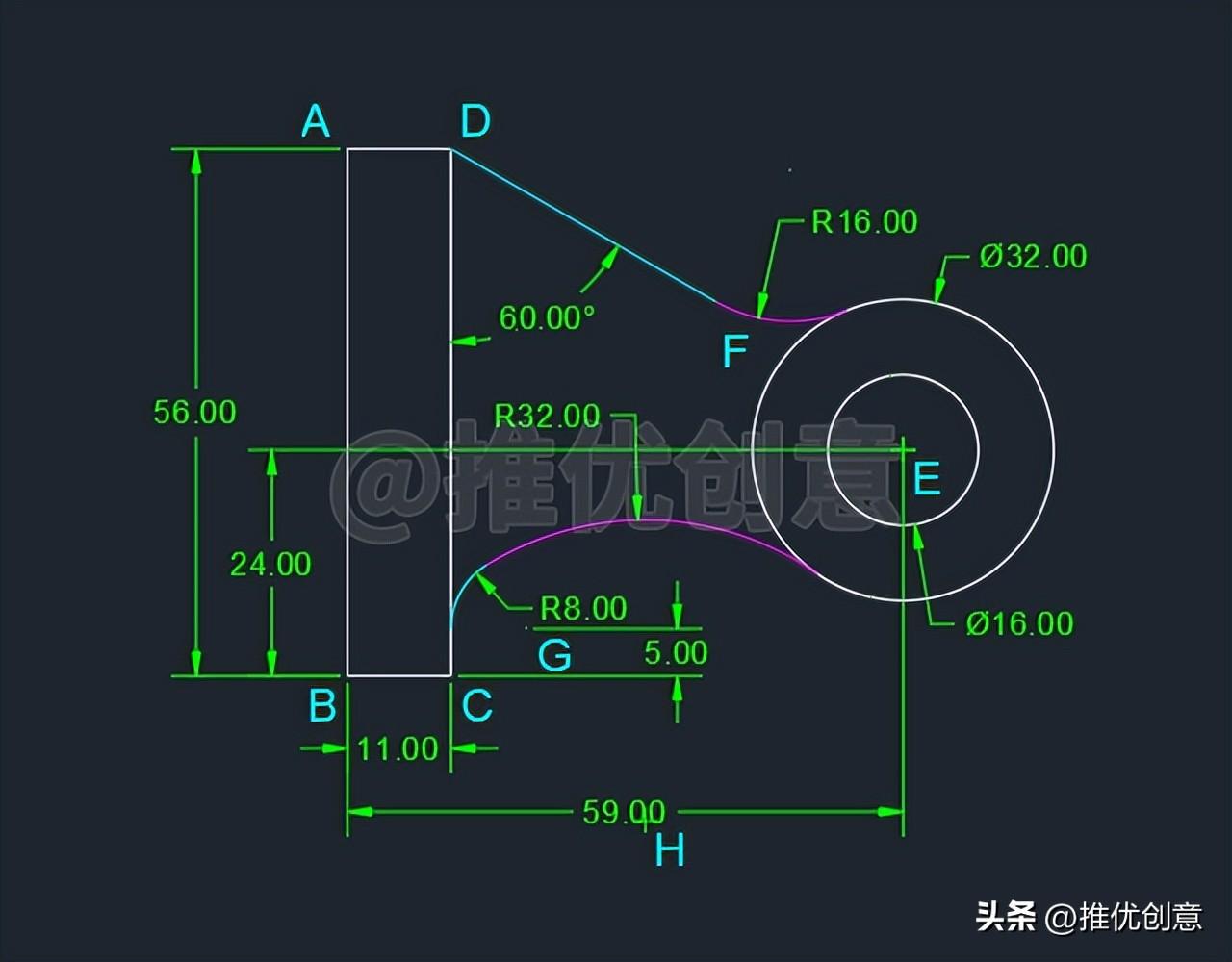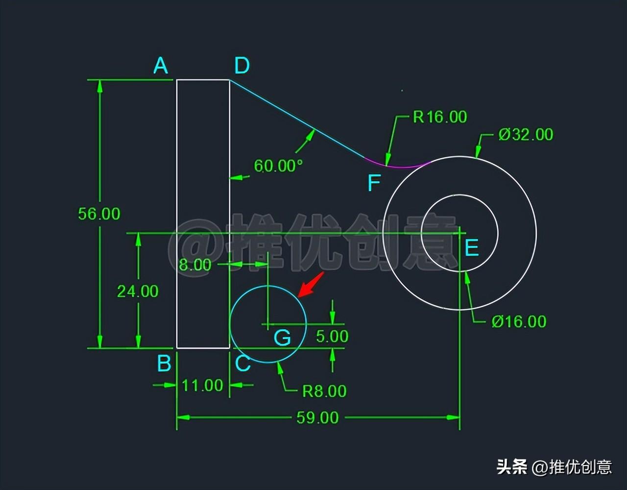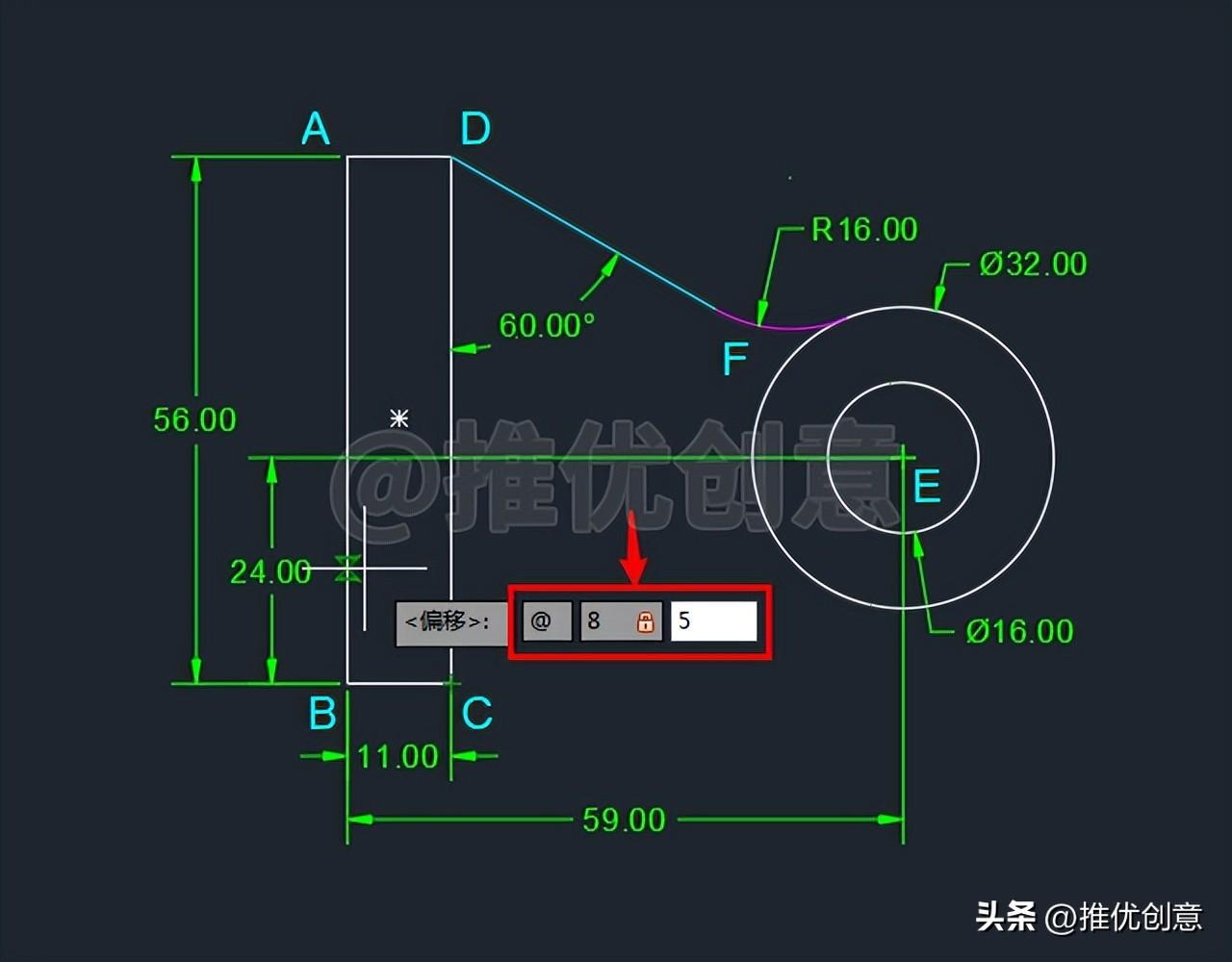 2.14、命令行输入“F ”后回车,启用“圆角 ”命令,接着输入“R ”后回车,选择设置圆角半径 ,输入圆角半径值 “16 ”后回车,对青色线段DF 与白色外圆E 倒圆角。