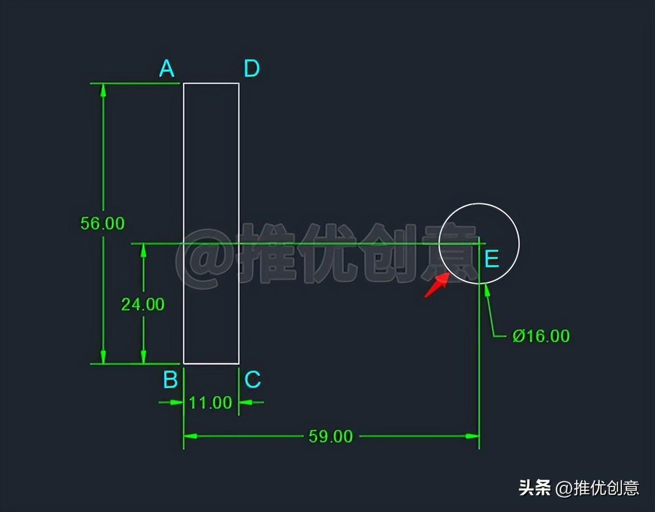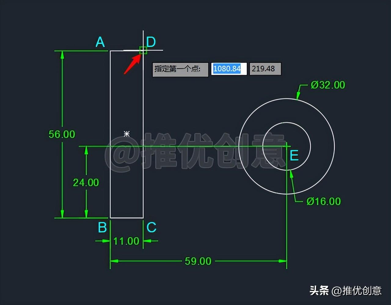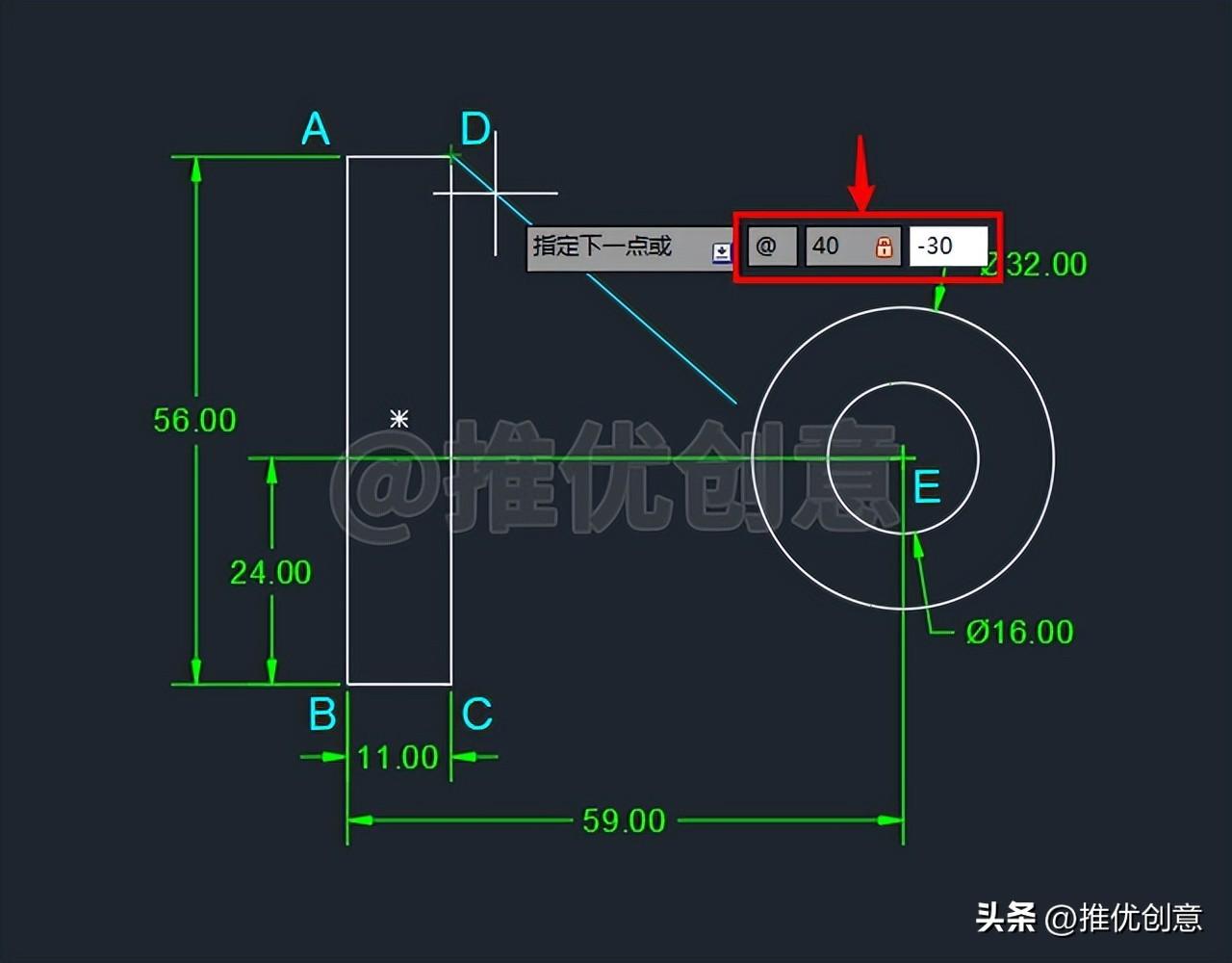 2.8、这样就绘制出了一个直径 为16 个单位的白色圆E ,圆心E 相对于点B 的相对坐标值 为“@59,24 ”。