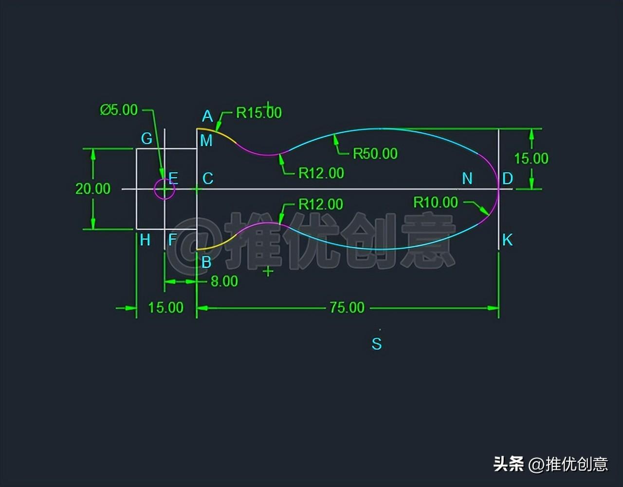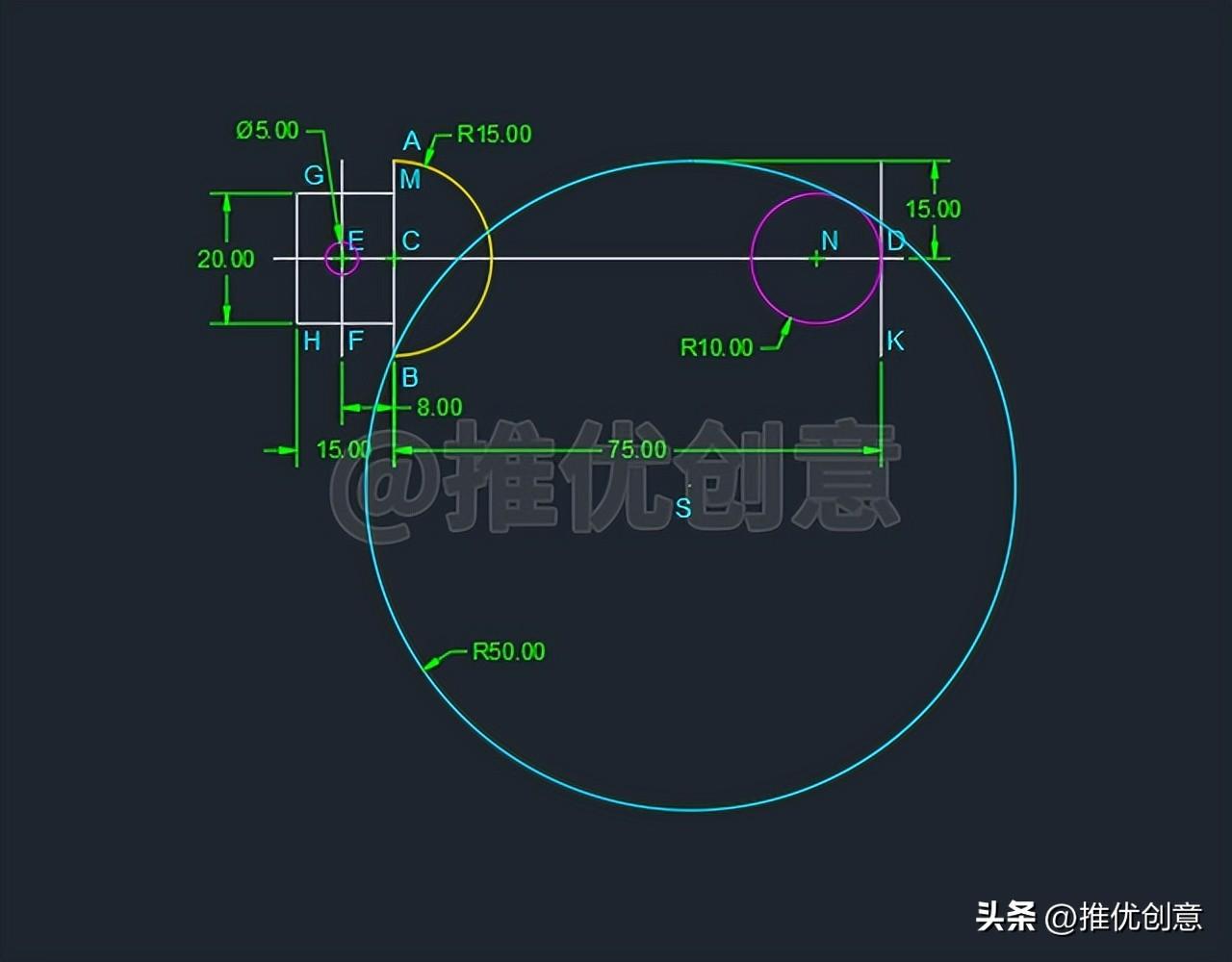 2.19、命令行输入“TR ”后回车,启用“修剪 ”命令,选择黄色圆弧C 、红色圆N 作为修剪边界 后回车 ,对青色圆S 进行修剪 ,完成后如下图。