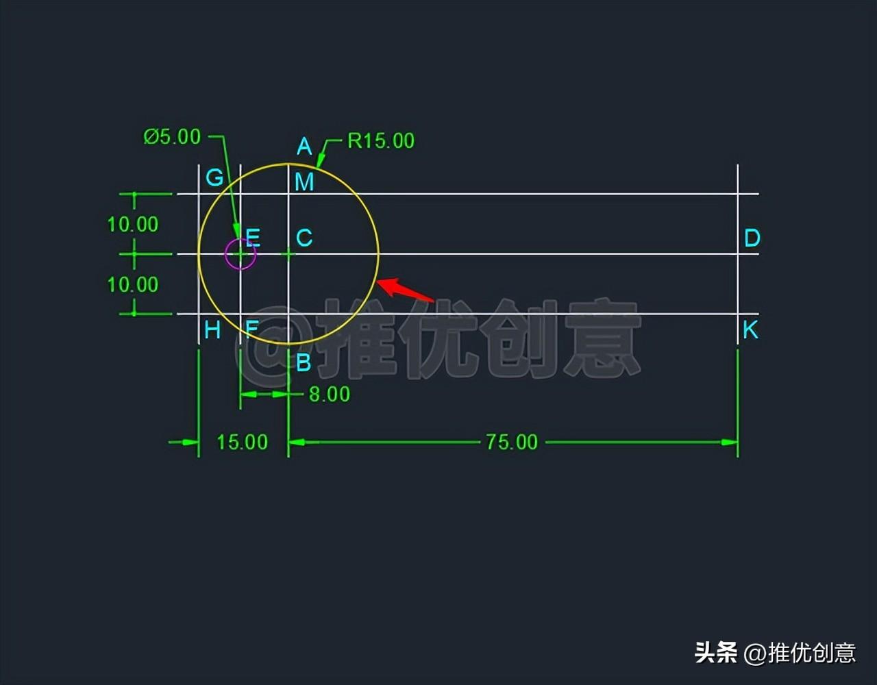 2.6、直接回车 ,再次启用“圆 ”命令,捕捉交点C 为圆心 ,绘制一个半径 为15 个单位的黄色圆C 。