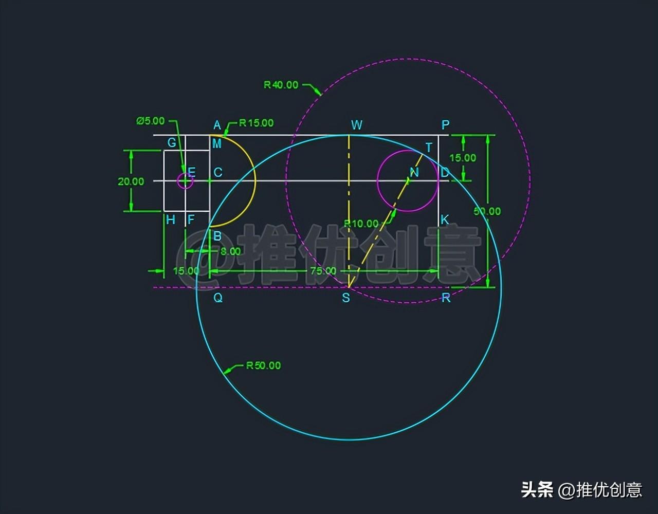 2.16、要绘制的R50的圆的圆心 既在红色虚线线段QR 上,又在红色虚线圆N 上,那么它的圆心就 是红色虚线线段QR 与红色虚线圆N 的交点 ,所以命令行输入“C ”后回车,启用“圆 ”命令,捕捉交点S 为圆心 ,绘制一个半径 为50 个单位的青色圆S 。