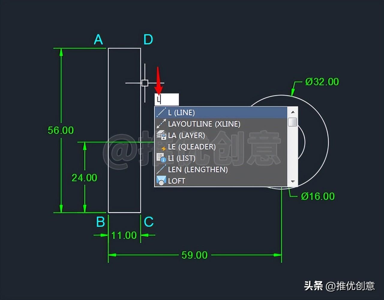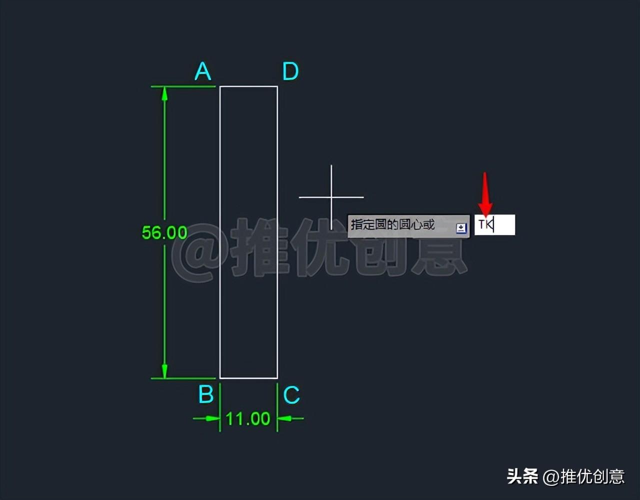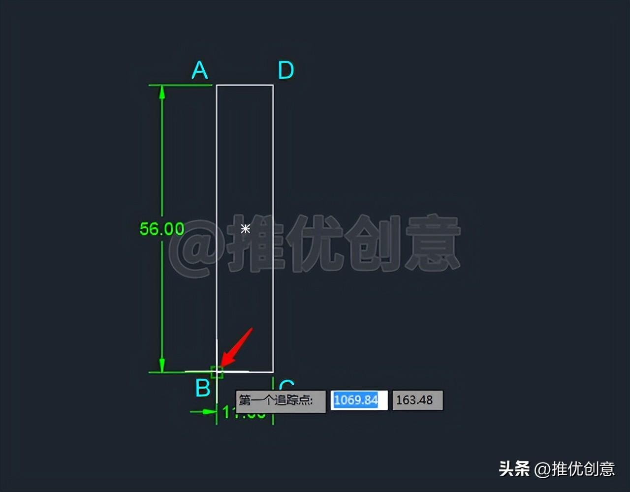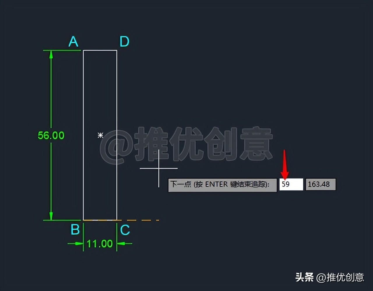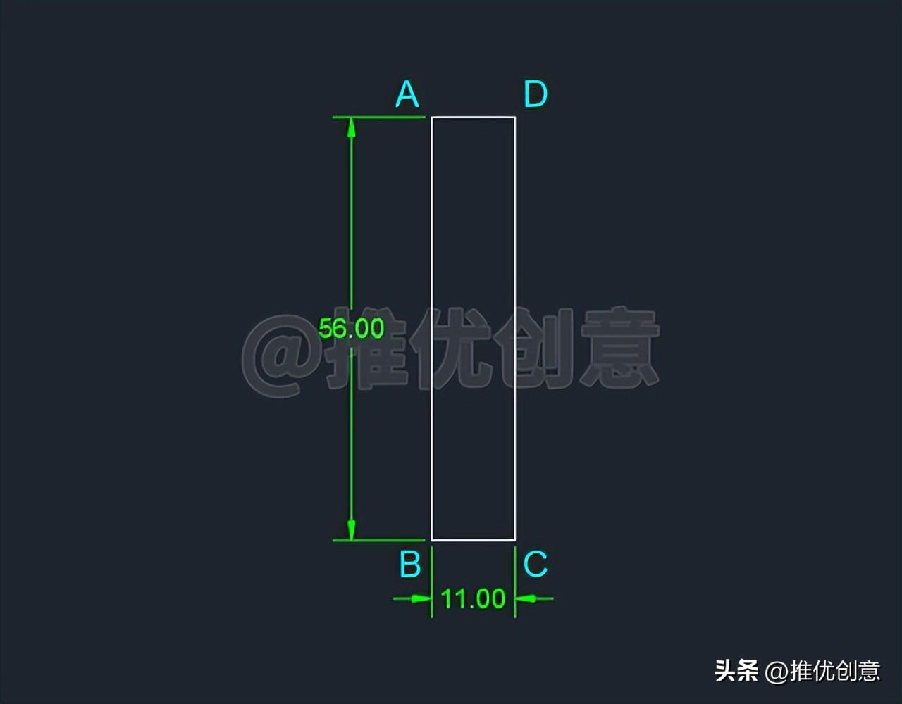 2.1、按键盘上的“F8 ”键,打开“正交 ”,命令行输入“REC ”后回车,启用“矩形 ”命令,绘制一个11x56 个单位的白色矩形ABCD 。