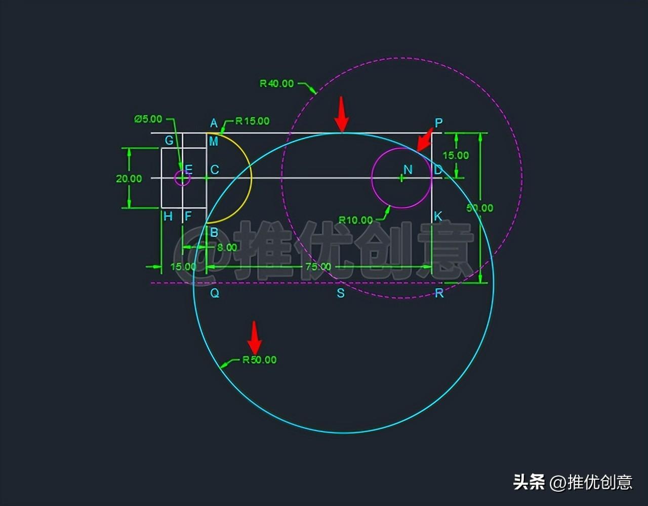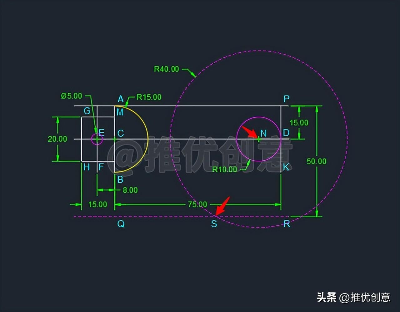 2.15、红色圆N 与要绘制的R50的圆 内切,因为“内切相减 ”,所以命令行输入“C ”后回车,启用“圆 ”命令,捕捉圆心N 为圆心 ,绘制一个半径 为“50-10=40 ”个单位的红色虚线圆N ,则要绘制的R50的圆的圆心 在这个红色虚线圆N 上。设红色虚线线段QR 与红色虚线圆N 在左边 交于点S 。