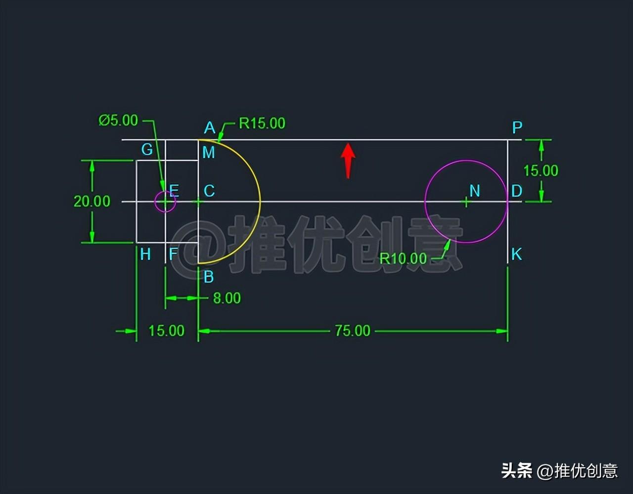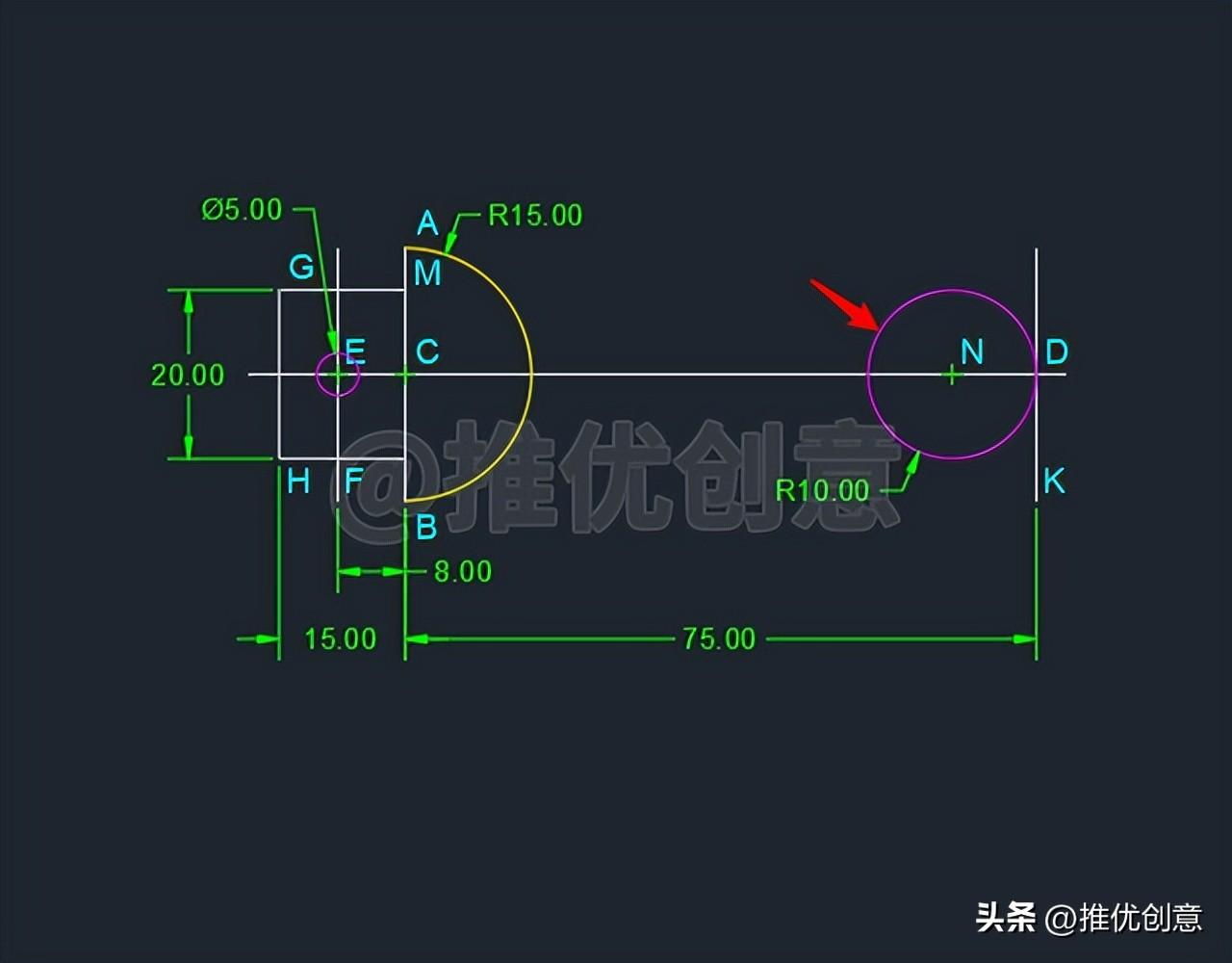 2.21、命令行输入“TR ”后回车,启用“修剪 ”命令,选择两条青色圆弧 作为修剪边界 后回车 ,对黄色圆弧C 、红色圆N 进行修剪 ,完成后如下图。