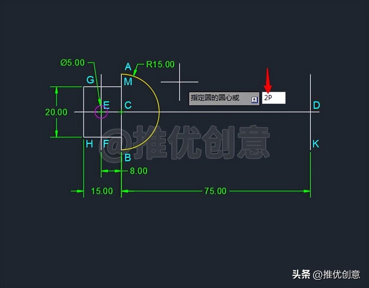 2.9、接着输入“2P ”后回车,选择两点 方式绘制圆 。