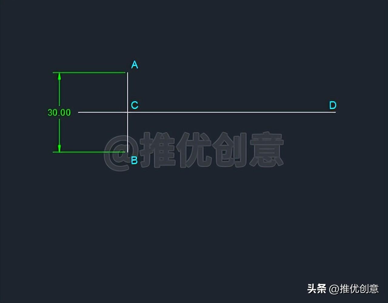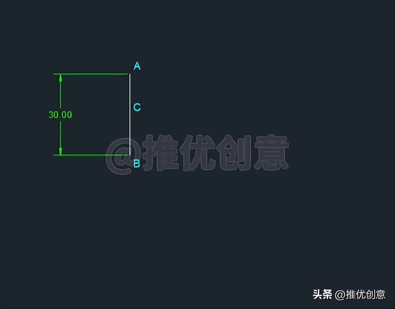 2.1、按键盘上的“F8 ”键,打开“正交 ”,命令行输入“L ”后回车,启用“直线 ”命令,绘制一条长度 为30 个单位的白色竖直线段AB ,设白色竖直线段AB的中点 为点C 。